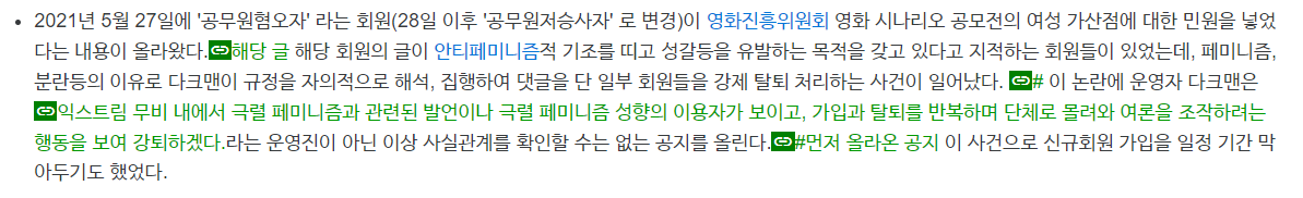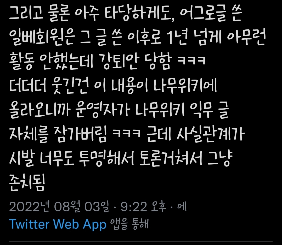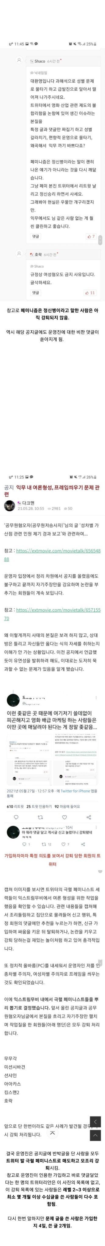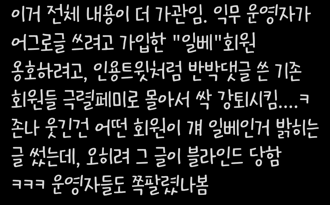 [스크랩] [칵.cxxxx]"일베" 회원 옹호하려고 기존 회원들 강퇴시킨 남초커뮤 작성자아니토라|작성시간22.08.05|조회수3,452 목록 댓글 7 글자크기 작게가 글자크기 크게가 출처 : https://twitter.com/seongeunmangeuk/status/1554803815576403968?t=5t4u20p-F5asR0Frd0HQXw&s=19 다음검색 스크랩 원문 : *여성시대* 차분한 20대들의 알흠다운 공간 현재 게시글 추가 기능 열기 북마크 공유하기 신고 센터로 신고 댓글 댓글 7 댓글쓰기 답글쓰기 댓글 리스트 삭제된 댓글입니다. 답댓글 작성자어쩌라구? | 작성시간 22.08.05 운영진이 한남이라는듯..? 작성자보통의인간 | 작성시간 22.08.05 사상 무슨 일이야 작성자이재몀 | 작성시간 22.08.05 어휴 작성자훠우워우 | 작성시간 22.08.05 경제나 스포츠 등 철학이나 사상에 대한 얘기를 나눌 껀덕지가 없는 커뮤니티도 아니고 예술 카테고리에 있는 영화 커뮤니티에서 PC주의 관련 이야기를 금지한다?ㅋㅋㅋ 댓글 전체보기