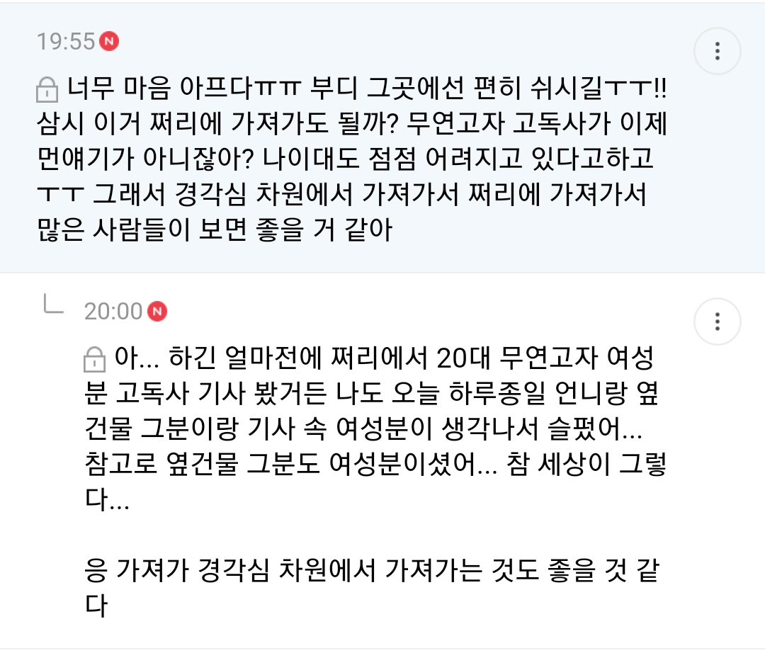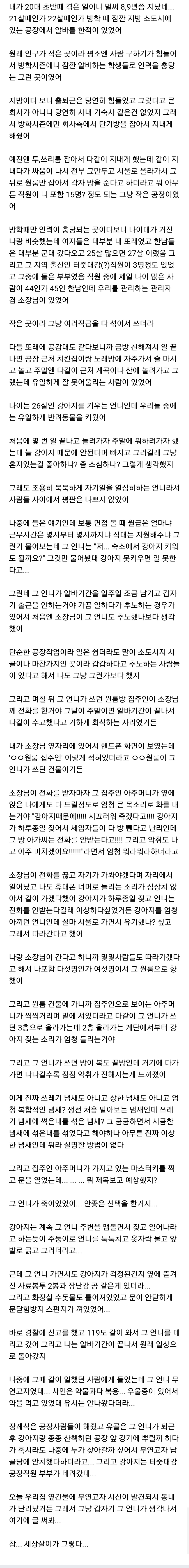 [스크랩] [눈물한방울]삼시들 사람 시체 본적 있어?.jpg 작성자피곤하다 피곤해|작성시간22.08.05|조회수13,038 목록 댓글 30 글자크기 작게가 글자크기 크게가 출처 : https://m.cafe.daum.net/subdued20club/W6EQ/659271?svc=cafeapp 허락 받고 가지고 옴 삼가 고인의 명복을 빕니다 다음검색 스크랩 원문 : *여성시대* 차분한 20대들의 알흠다운 공간 현재 게시글 추가 기능 열기 북마크 공유하기 신고 센터로 신고 댓글 댓글 30 댓글쓰기 답글쓰기 댓글 리스트 작성자정안과 | 작성시간 22.08.05 삼가 고인의 명복을 빕니다 작성자우탕탕탕우영우 | 작성시간 22.08.05 삼가 고인의 명복을 빕니다 작성자부산어묵구 | 작성시간 22.08.05 삼가 고인의 명복을 빕니다 작성자트리마제주삼 | 작성시간 22.08.05 삼가 고인의 명복을 빕니다 작성자춘봉당 | 작성시간 22.08.05 삼가 고인의 명복을 빕니다 댓글 전체보기
