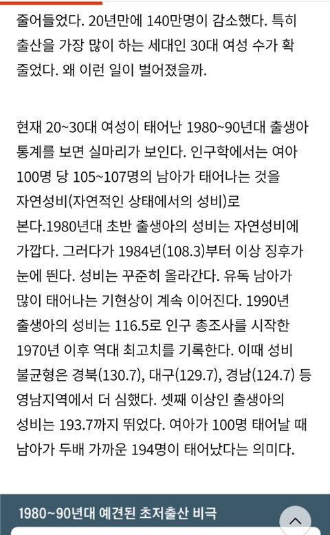 8090년대 성비 : 110~120이 평균. 경상도의 경우 130까지 치솟음. 특히 셋째아이 성비는 190. 즉 여아 100명 당 30~90명의 남아가 더 태어남.