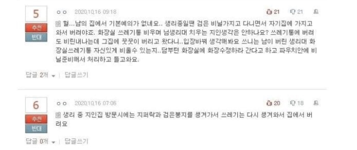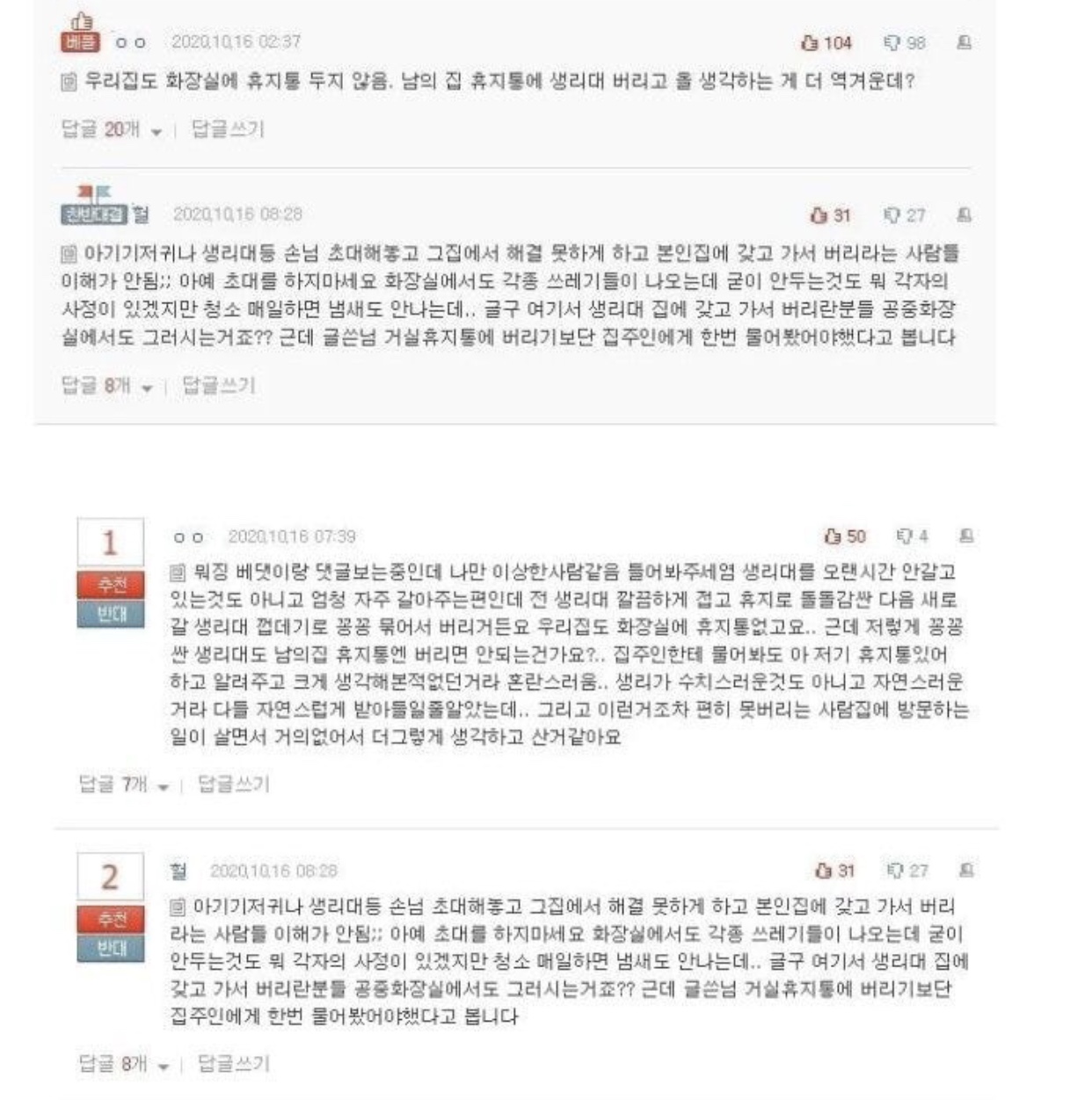 댓글 읽고왔는데 다들 생리 터부시하는거 아니라 다행이네 첨에 글보고 깜짝놀람 아니 진짜 댓여시들 말대로 쓰레기를 쓰레기통에 못버리게 할거면 초대를 말아야돼~! ㅋㅋ -