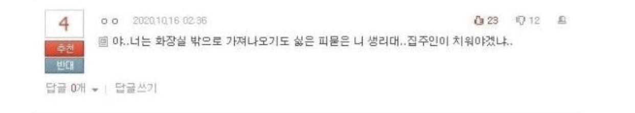 답댓글 작성자치즈볼존맛탱구리 작성시간 22.08.07 진짜 구라아니고 쌩판모르는 사람이 급해서 우리집 화장실을 써서 생리대 버려도 아무렇지도 않음 ㄹㅇ