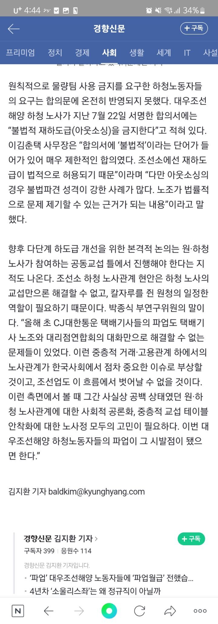 [여시뉴스데스크]조선소 다단계 하도급 ‘물량팀’이 문제다 (많관부) 작성자엘지모니터|작성시간22.08.05|조회수753 목록 댓글 4 글자크기 작게가 글자크기 크게가 출처 : http://naver.me/G0IGVKzJ조선소 다단계 하도급 ‘물량팀’이 문제다“원청에서 1차 하청업체, 그리고 물량팀(1차 하청업체로부터 단기 재하도급을 받아 일하는 비정규직 노동자)으로 가는 과정에서 ‘기성(도급비) 후려치기’가 이뤄집니다. 혹시 물량팀에 대해 n.news.naver.com정말 심각해노동자들이 개보다 못한대접을 받고있는데 관심이 부족한것같아 제발 기사 자세히 읽어봐주라! 다음검색 현재 게시글 추가 기능 열기 북마크 공유하기 신고 센터로 신고 댓글 댓글 4 댓글쓰기 답글쓰기 댓글 리스트 작성자쿠루루핑퐁 | 작성시간 22.08.05 요새 하청에 본팀이 어딨어 다 물량팀이지 물량팀 진짜 좃구림... 진짜 처우좀 개선해주라 작성자조의리의리 | 작성시간 22.08.05 물량팀 팀장은 돈 개많이 버는데... ..... 작성자퐁당퐁당재기던지자 | 작성시간 22.08.05 중간에서 피빨아먹는 업체 많아 그럼 헌법에 금지된 중간착취인데 작성자energetic | 작성시간 22.08.05 하청에 하청을 주니까... 중간에서 다 빼먹고 댓글 전체보기