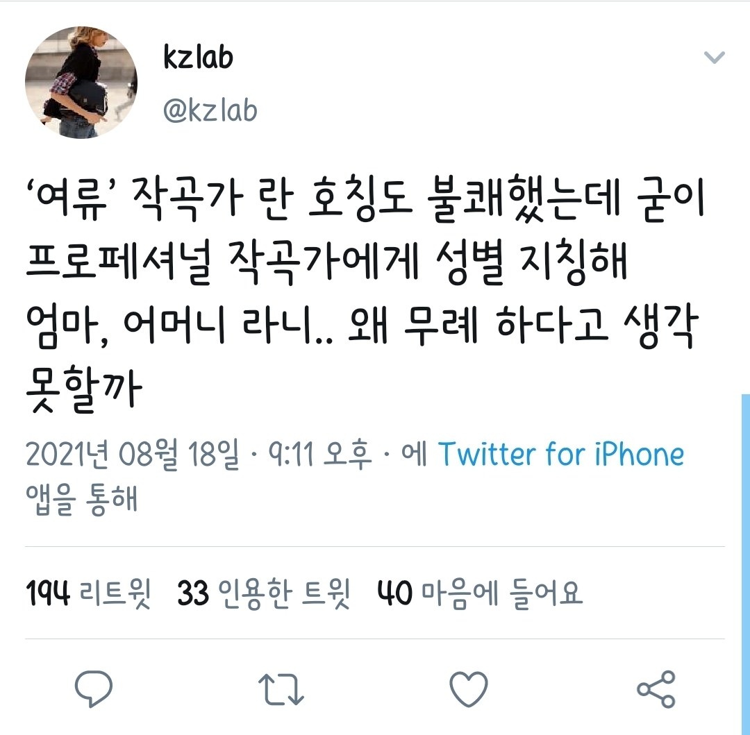 “‘여류’ 작곡가 란 호칭도 불쾌했는데 굳이 프로페셔널 작곡가에게 성별 지칭해 엄마, 어머니 라니.. 왜 무례 하다고 생각 못할까”