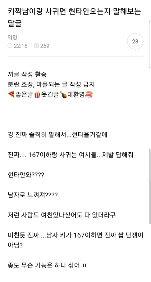 2.같이 다니다가 키큰남자나 여자 지나갈때의 그 수치심,, 키는 냄져새끼가 작은데 내가 수치심 오짐