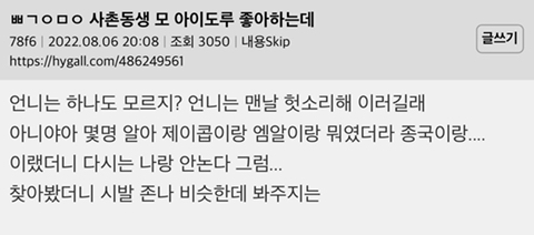[흥미돋]사촌동생이 모 아이돌을 좋아하는데 작성자MoMAA|작성시간22.08.06|조회수13,904 목록 댓글 28 글자크기 작게가 글자크기 크게가 출처 : https://hygall.com/486249561원글 커뮤가 해외연예인 덕질하는 커뮤라국내연예인 1도 모르는 사람들이 많이 모여있음 다음검색 현재 게시글 추가 기능 열기 북마크 공유하기 신고 센터로 신고 댓글 댓글 28 댓글쓰기 답글쓰기 댓글 리스트 작성자네버보리 | 작성시간 22.08.06 맞는게없노 작성자최재철 | 작성시간 22.08.06 제이콥은 더보이즈고ㅋㅋㅋㅋㅋㅋㅋㅋㅋㅋㅋㅋㅋㅋㅋ 작성자복규 | 작성시간 22.08.07 와 난 제이콥이 아니라 에스쿱스지~~ 이러고 있었네 작성자냐앗 | 작성시간 22.08.07 ㅋㅋㅋㅋㅋㅋ아 제이콥 엠알 맞고 종국은 넘했네~~ㅋ 했는데 무슨 다틀렸노ㅠㅠ 작성자냥신 | 작성시간 22.08.07 나도 보고 종국은 맞네 ㅇㅈㄹ ㅋㅋㅋㄱㅂㅋㅋㅋ 무슨 그룹인지도 긴가민가.... 댓글 전체보기