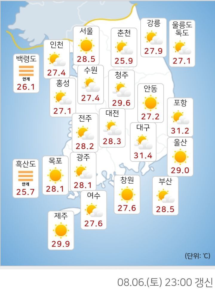 [흥미돋]현시각 전국 온도.jpg 작성자단델리온|작성시간22.08.06|조회수53,796 목록 댓글 45 글자크기 작게가 글자크기 크게가 출처 : 여성시대 단델리온전국적으로 열대야🥵 다음검색 현재 게시글 추가 기능 열기 북마크 공유하기 신고 센터로 신고 댓글 댓글 45 댓글쓰기 답글쓰기 댓글 리스트 작성자댐버링드 | 작성시간 22.08.07 진짜 오늘 나갔다가 습도때매 기절하는줄앟았어 작성자모비딕의 향고래 | 작성시간 22.08.07 왜 아직도 29도야 작성자부대찌개냠 | 작성시간 22.08.07 더워서 이시간에 샤워했어 작성자말랑말랑한 감자 | 작성시간 22.08.07 대전은.. 시원해요.. 대전 오세요 다덡 작성자R=VD로또1등단독당첨 | 작성시간 22.08.07 내방은 34도^_^ 댓글 전체보기