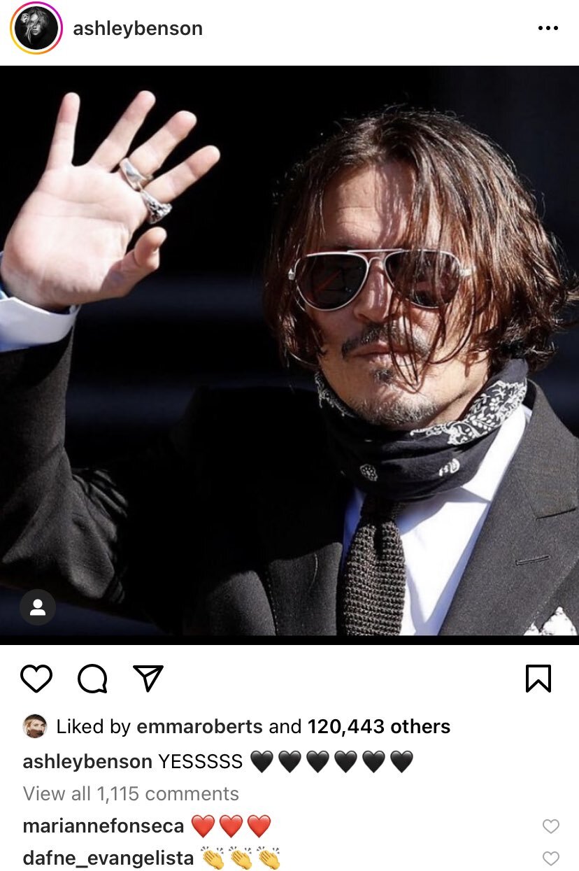 에슐리 벤슨이 올린 조니 뎁 축하글에도 좋아요