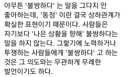 작성자서함이대신군머갈한남손들어 작성시간 22.08.08 오히려 사전상으로는 안쓰럽다에 위아래가 있지 불쌍하다에는 위아래가 없는데