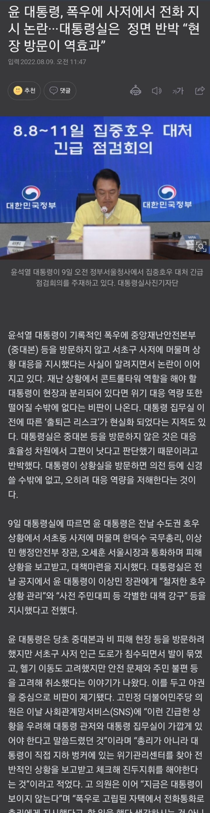 작성자아이패드 작성시간 22.08.09 현장 방문을 하라는게 아니라..... 아니 뭐이렇게 일머리가 없어? 집에서 각 지자체 상황실에서 올라오는 보고를 어떻게 핸드폰 한통으로 다 받을건데.
