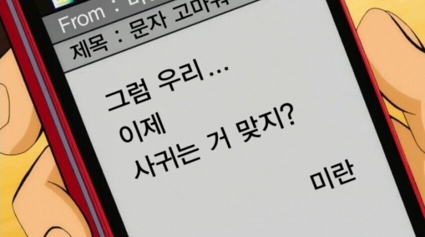 [스크랩] [흥미돋][명탐정 코난] 연재 23년만에 드디어 커플 된 남도일♡유미란.jpg 작성자LILLY|작성시간22.08.09|조회수13,317 목록 댓글 61 글자크기 작게가 글자크기 크게가 출처 : 여성시대 LILLY927-928회 이후로 드디어 사귀는 사이 됨그러니까 연재 23년(아닐수도 24년일수도)만에 커플이 된거임ㅋㅋㅋㅋㅋㅋ그동안은 그냥 남사친 여사친이였음근데 어차피 극중에선 코난으로 변한지 1년도 안 됨ㅠ란 귀여워ㅠ 다음검색 스크랩 원문 : *여성시대* 차분한 20대들의 알흠다운 공간 현재 게시글 추가 기능 열기 북마크 공유하기 신고 센터로 신고 댓글 댓글 61 댓글쓰기 답글쓰기 댓글 리스트 작성자허브탕 | 작성시간 22.08.09 근데 아직 폴더폰 써? 짱구네 철수도 에어팟 쓰던데 작성자한산도 대첩 | 작성시간 22.08.09 잉 코난 다시 커졌어?어케 데이트 했대??? 작성자냥냥뀨 | 작성시간 22.08.10 사귀는게 아녔어…..?ㅋㅋㅋㅋㅋㅋㅋㅋㅋ 작성자watuwnt | 작성시간 22.08.10 1년이요?ㅠ 작성자휘인 | 작성시간 22.08.10 와우 드뎌 댓글 전체보기