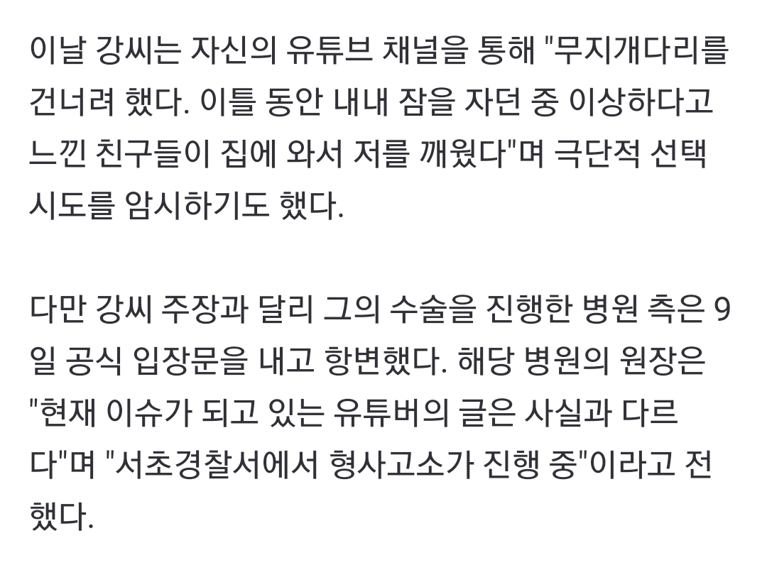 [여시뉴스데스크]"코 녹아내려"…유튜버 강학두, 성형 부작용에 극단선택 암시 작성자NO:ZE|작성시간22.08.11|조회수23,101 목록 댓글 75 글자크기 작게가 글자크기 크게가 출처 : https://n.news.naver.com/article/119/0002629185?cds=news_my"코 녹아내려"…유튜버 강학두, 성형 부작용에 극단선택 암시유명 유튜버 강학두가 코 성형 부작용을 호소하며 병원 측과 법적 공방을 예고했다. 그는 이날 '무지개 다리를 건너려 했다'며 극단 선택을 암시하기도 했다. 8일 강씨는 온라인을 통해 "유튜버 n.news.naver.com 다음검색 현재 게시글 추가 기능 열기 북마크 공유하기 신고 센터로 신고 댓글 댓글 75 댓글쓰기 답글쓰기 댓글 리스트 작성자슴슴하게 | 작성시간 22.08.11 난 모르겟어~~ 진짜 응원했는데..^^ 작성자딱복킬러 | 작성시간 22.08.11 작성자까까깎 | 작성시간 22.08.11 아니 뭐돼? 삭제된 댓글입니다. 답댓글 작성자한남소리가 소원 | 작성시간 22.08.12 ㅋㅋㅋㅋㅋㅋㅋㅋㅋㅋㅋㅋㅋ 댓글 전체보기