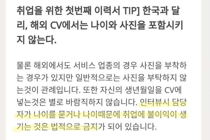 [스크랩] [기타]이력서에 '나이(생년월일)기입' 필요하다 vs 아니다 작성자pasta al limone|작성시간22.08.11|조회수2,640 목록 댓글 22 글자크기 작게가 글자크기 크게가 1. 필요하다2. 아니다 다음검색 스크랩 원문 : 쭉빵카페 현재 게시글 추가 기능 열기 북마크 공유하기 신고 센터로 신고 댓글 댓글 22 댓글쓰기 답글쓰기 댓글 리스트 작성자백설왕만두 | 작성시간 22.08.11 2 작성자큐식 | 작성시간 22.08.12 2 작성자독립성공 | 작성시간 22.08.12 2 작성자별의진달래 | 작성시간 22.08.12 난 나보다 나이많은 남자 안뽑는데 ㅎ 작성자딸ㄱ1 | 작성시간 22.08.12 애초에 뽑을 때 20~30대 이렇게 올림 끝이자너 댓글 전체보기