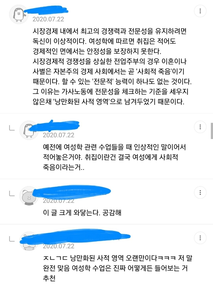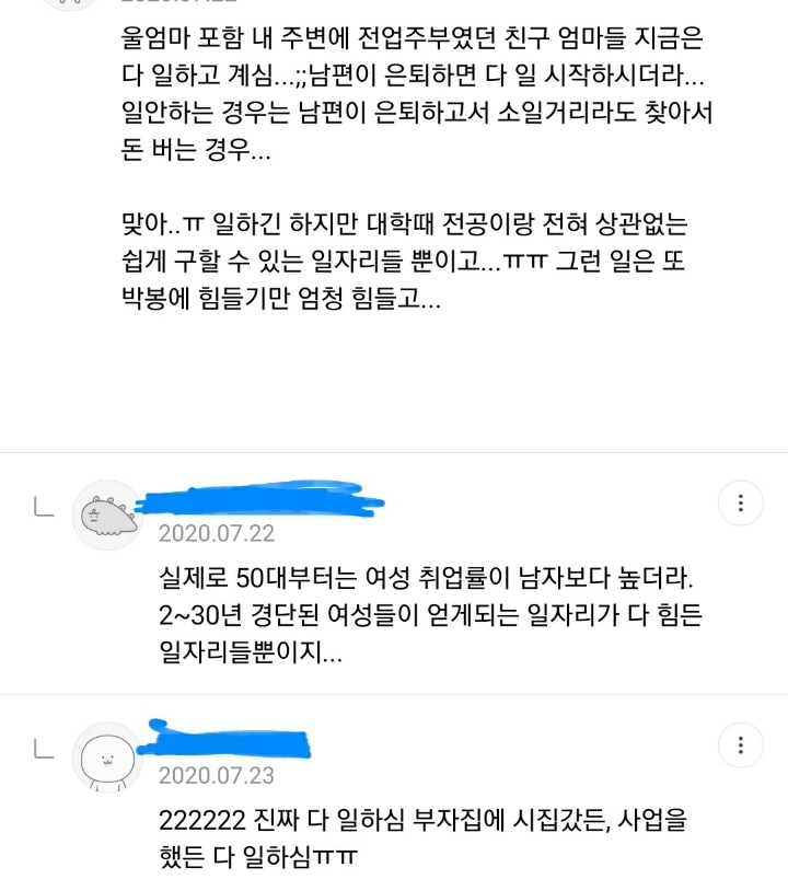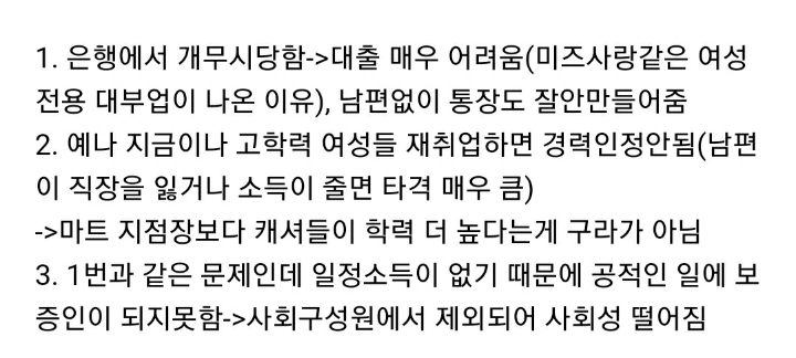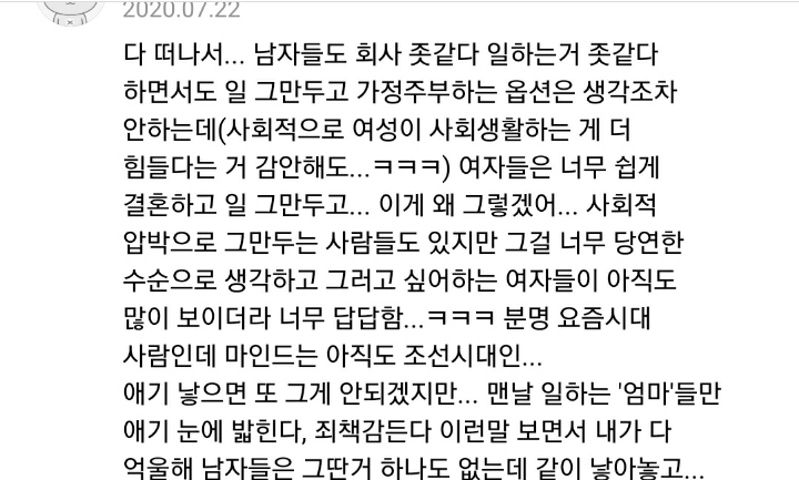 그렇다면 남편도 가사, 육아 같이 하는 방향으로 가야지 절대 여자가 일을 그만두는 방향이 되면 안된다는거야. 여자가 일을 그만둬버리면 우리나라 뿌리박힌 가부장제를 더욱더 강하게만드는것일 뿐이야. -