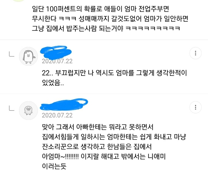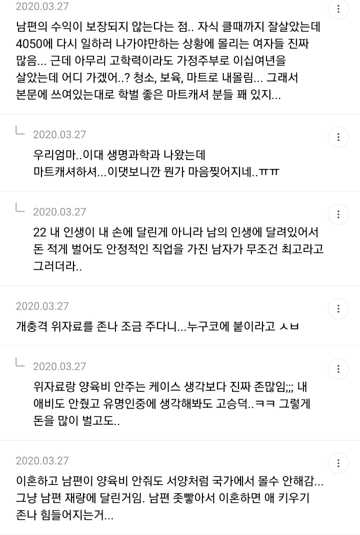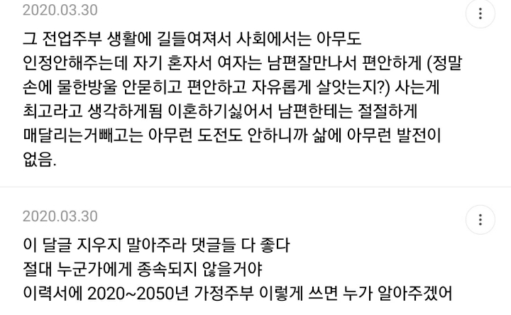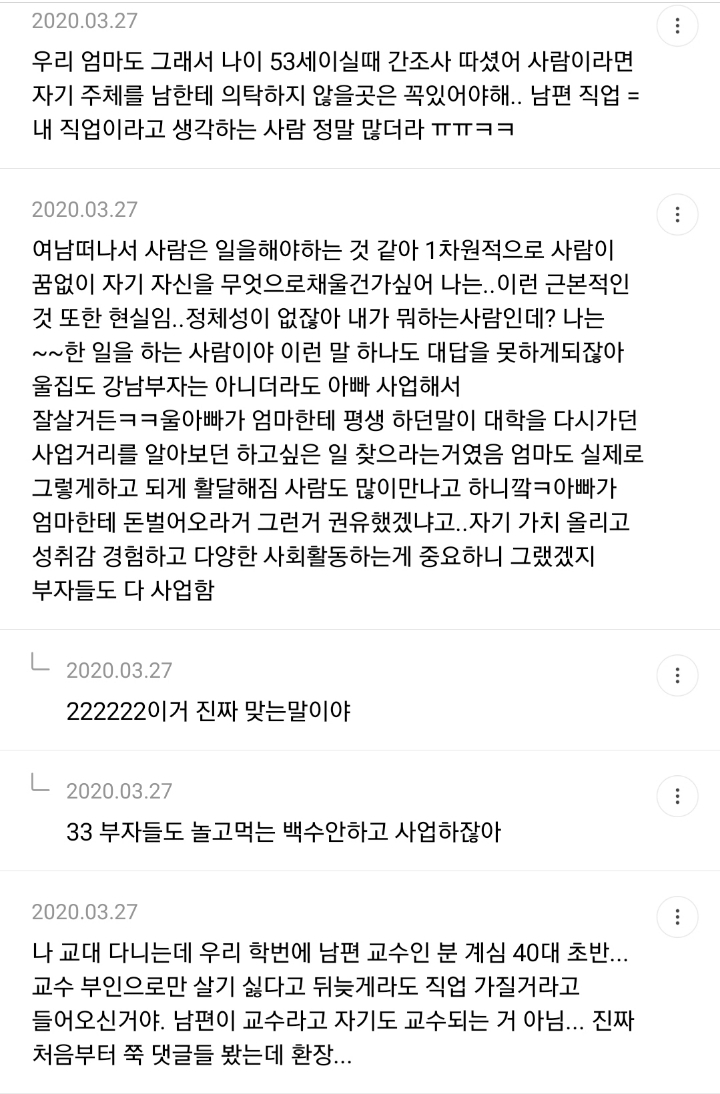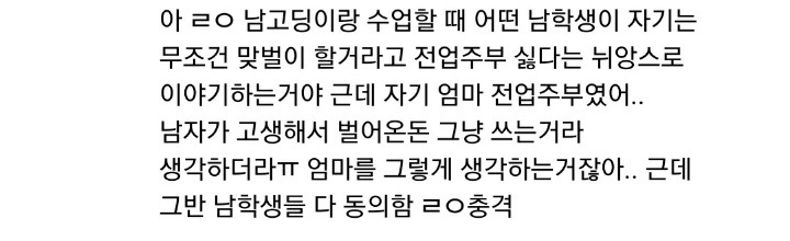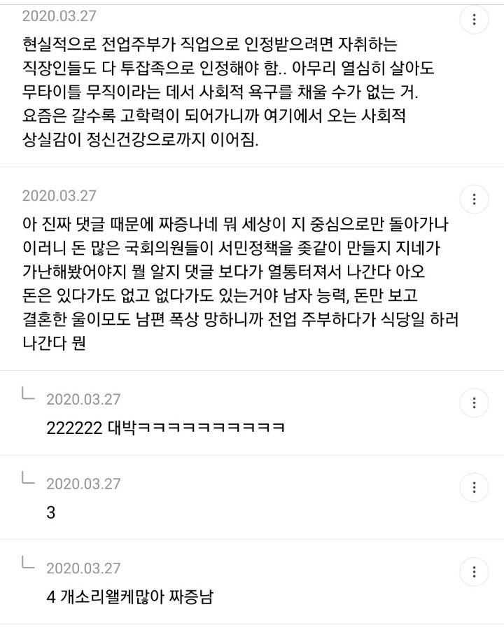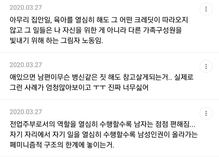 남자들 전업편하게잇는다고욕하면서 정작지들은절대안하자나ㅋㅋ 진짜편하고조은거엿음 벌써남자들이전업하고잇을듯 -