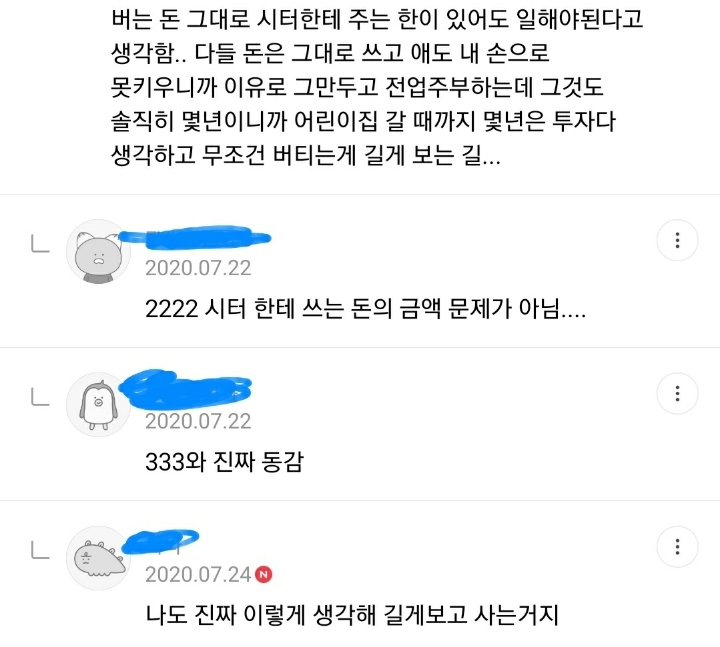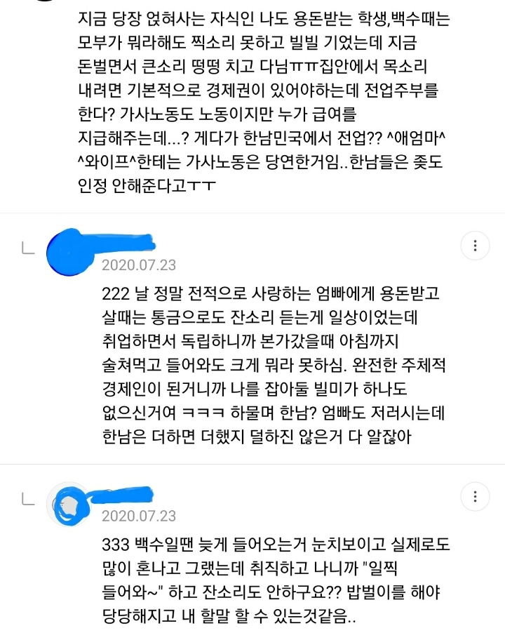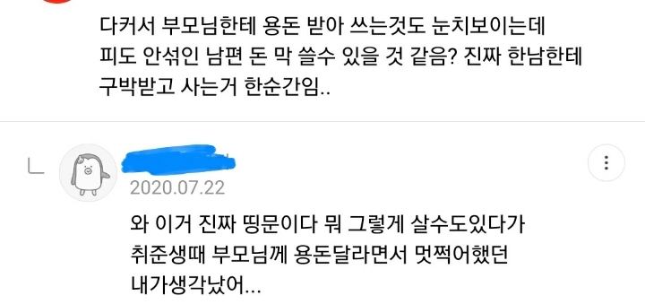 작성자여드름싫어 작성시간 22.08.15 휴일도 퇴근도없이일하는데 돈눈치보면서써야하고 개무시당함