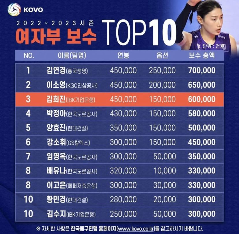 여자부 연봉 1위 김연경 : 7억