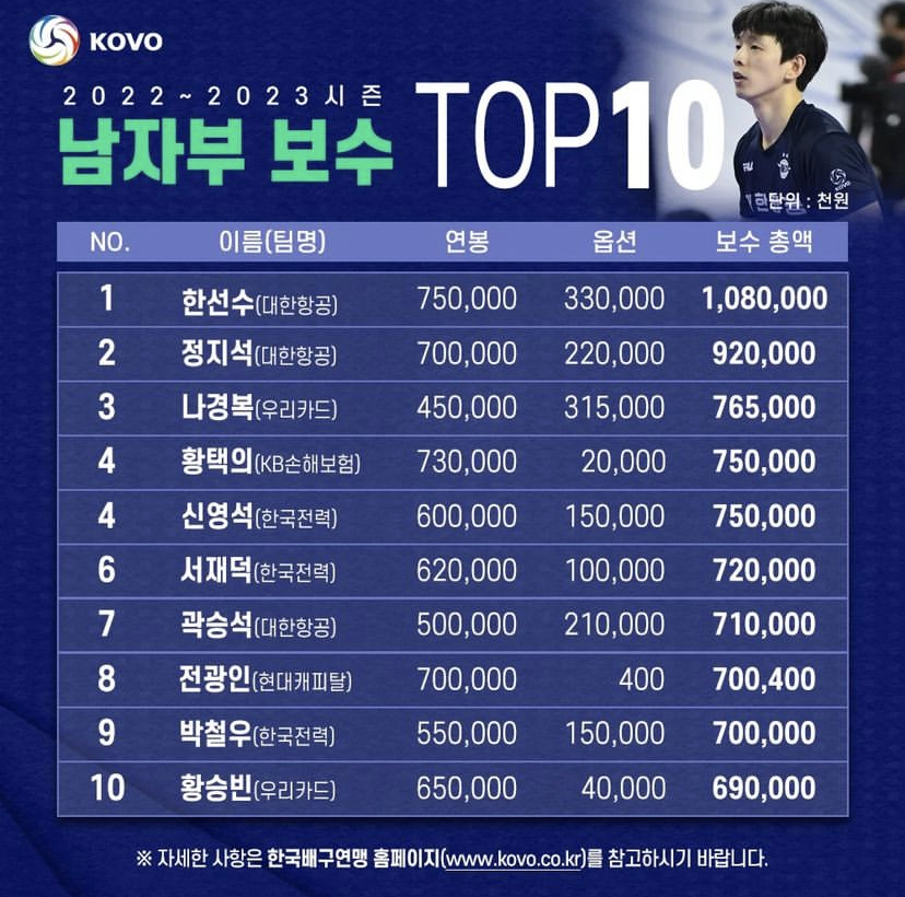 남자부 연봉 10위=여자부 연봉 1위와 거의 비슷함