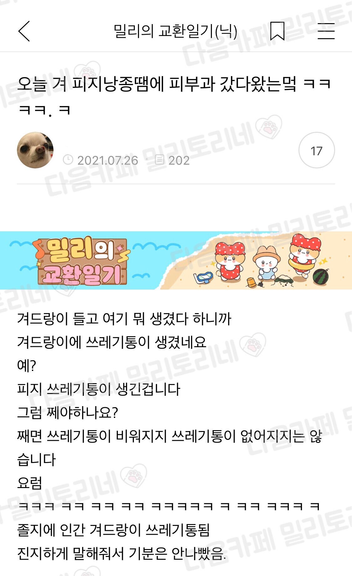 [기타]오늘 겨 피지낭종땜에 피부과 갔다왔는데ㅋㅋㅋㅋ 작성자리샤|작성시간22.08.19|조회수82,954 목록 댓글 56 글자크기 작게가 글자크기 크게가 출처 : https://m.cafe.daum.net/baemilytory/91cd/362491?svc=cafeapp 다음검색 현재 게시글 추가 기능 열기 북마크 공유하기 신고 센터로 신고 댓글 댓글 56 댓글쓰기 답글쓰기 댓글 리스트 삭제된 댓글입니다. 답댓글 작성자니예니예잘알았숨다 | 작성시간 22.08.19 피지주머니인가봐! 아프지 않았어?? 답댓글 작성자니예니예잘알았숨다 | 작성시간 22.08.19 이사가욥 부럽다증말 나도 주머니 짜보고싶어…. 작성자할수있도ㅑ | 작성시간 22.08.20 https://youtube.com/channel/UCFQtb7VzPKnRisKxAqO1wjw 답댓글 작성자할수있도ㅑ | 작성시간 22.08.20 여기 추천함다,,,, 쾌감오짐 댓글 전체보기