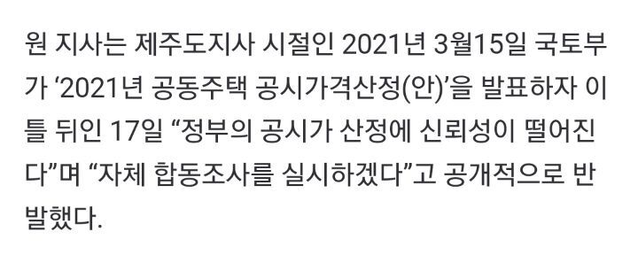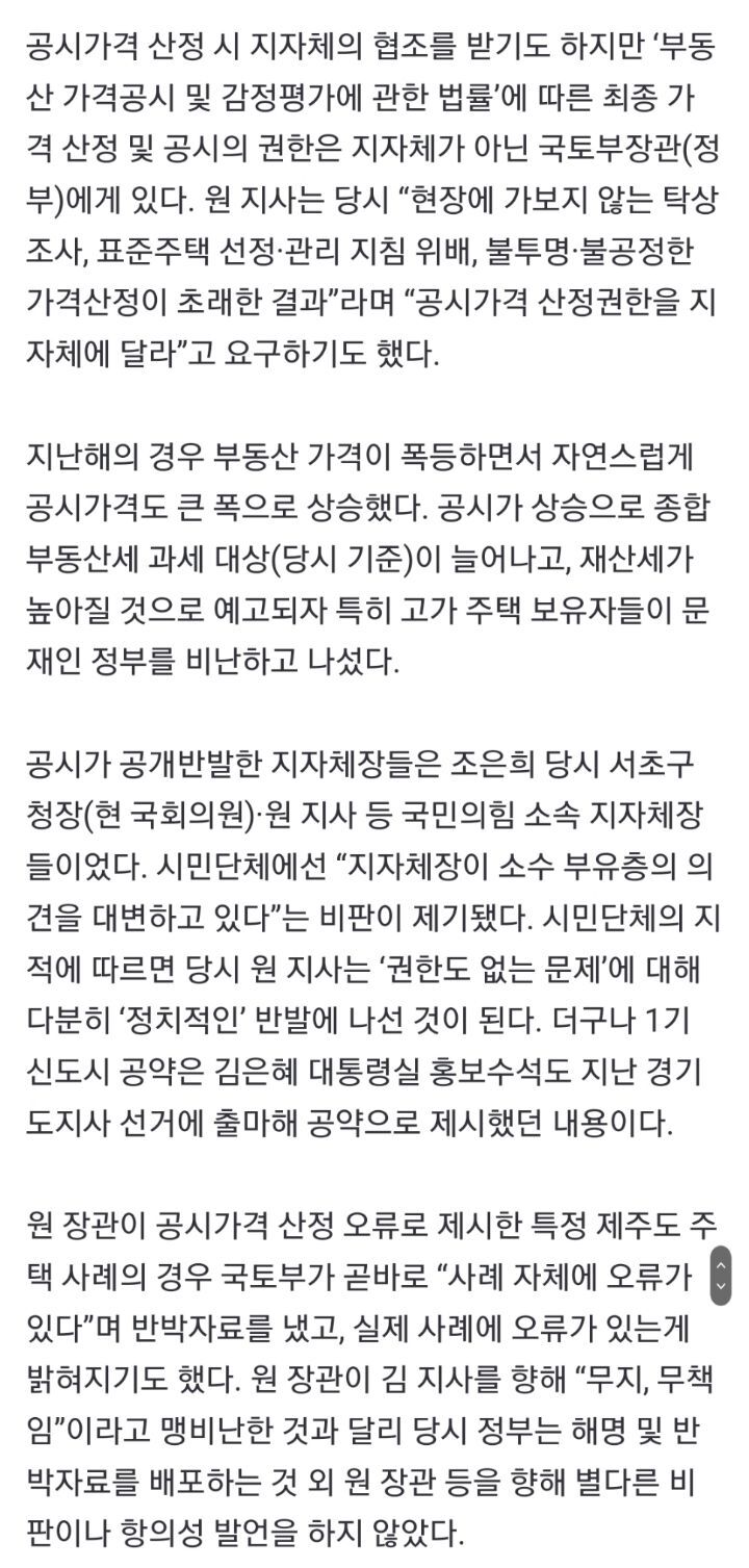 원 장관이 공시가격 산정 오류로 제시한 특정 제주도 주택 사례의 경우 국토부가 곧바로 “사례 자체에 오류가 있다”며 반박자료를 냈고, 실제 사례에 오류가 있는게 밝혀지기도 했다. 원 장관이 김 지사를 향해 “무지, 무책임”이라고 맹비난한 것과 달리 당시 정부는 해명 및 반박자료를 배포하는 것 외 원 장관 등을 향해 별다른 비판이나 항의성 발언을 하지 않았다.