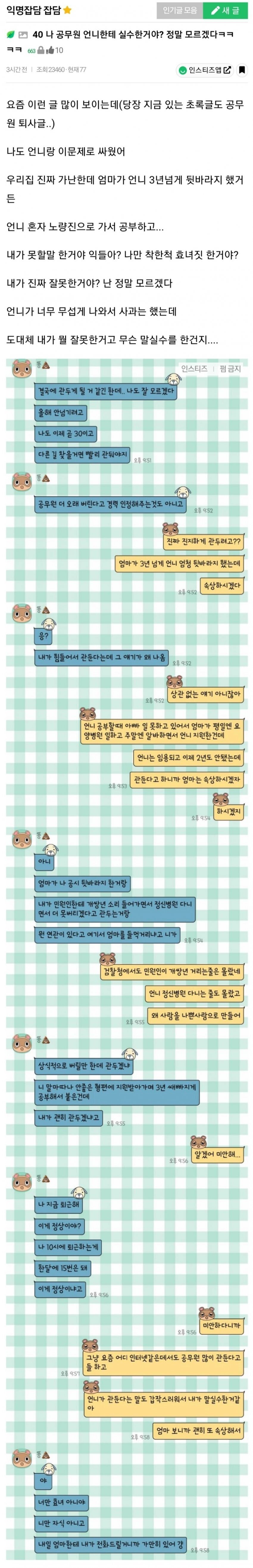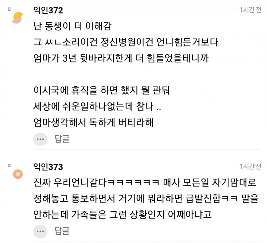 작성자프랑스는 베이컨 작성시간 22.08.24 그런고민은 본인이제일 많이했을건데 동생입장더 이해가지만 언니입장도 이해감..