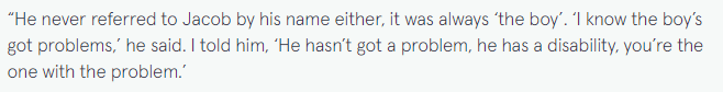 그는 제이콥을 결코 그의 이름으로 지칭하지 않았다. 그는 계속 제이콥을 소년이라고 칭하였다. "나는 그 소년이 문제가 있다는 것을 안다."라고 그가 말했다. 나는 그에게 "그는 문제가 없고, 그는 장애가 있고, 당신이 문제를 가지고 있다"고 말했다.
