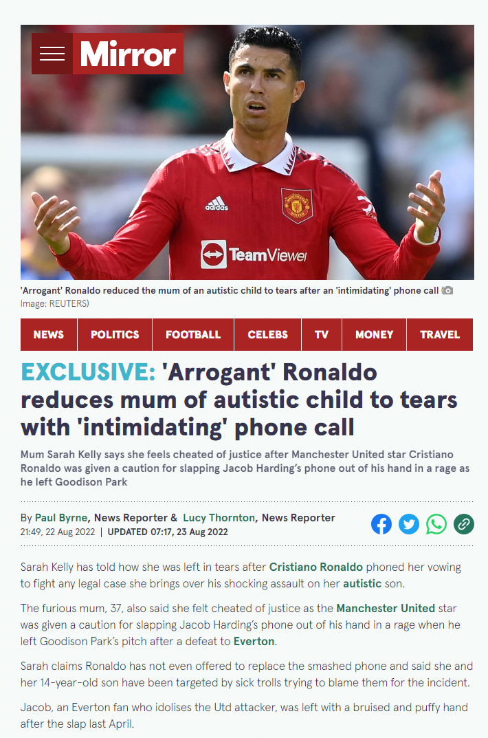 호날두는 전화로 "나는 끔찍한 교육을 받았고, 아버지를 잃었다"고 말했다. 나는 그에게 "모든 사람들은 당신처럼 슬픈 이야기를 가지고 있어. 나도 어릴적 나의 아버지를 잃었어."라고 말했다.