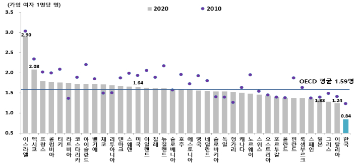 2020년 기준 OECD 국가 평균 합계출산율은 1.59명으로, 합계출산율이 채 1명도 되지 않은 국가는 우리나라가 유일했다.