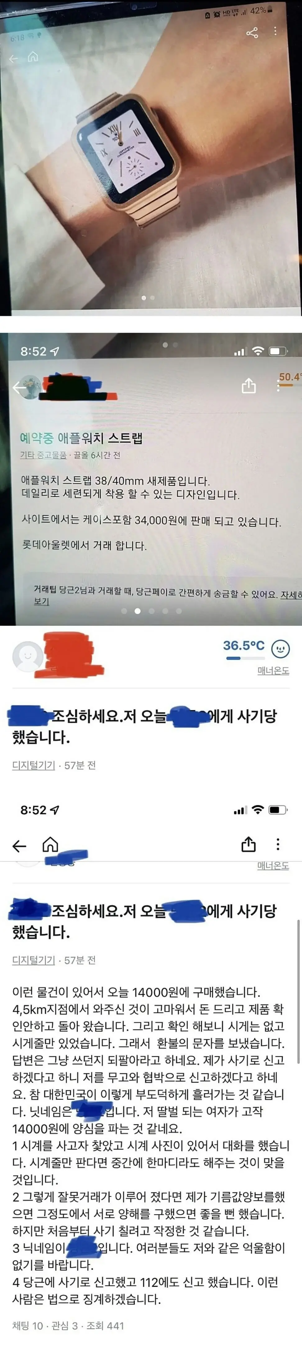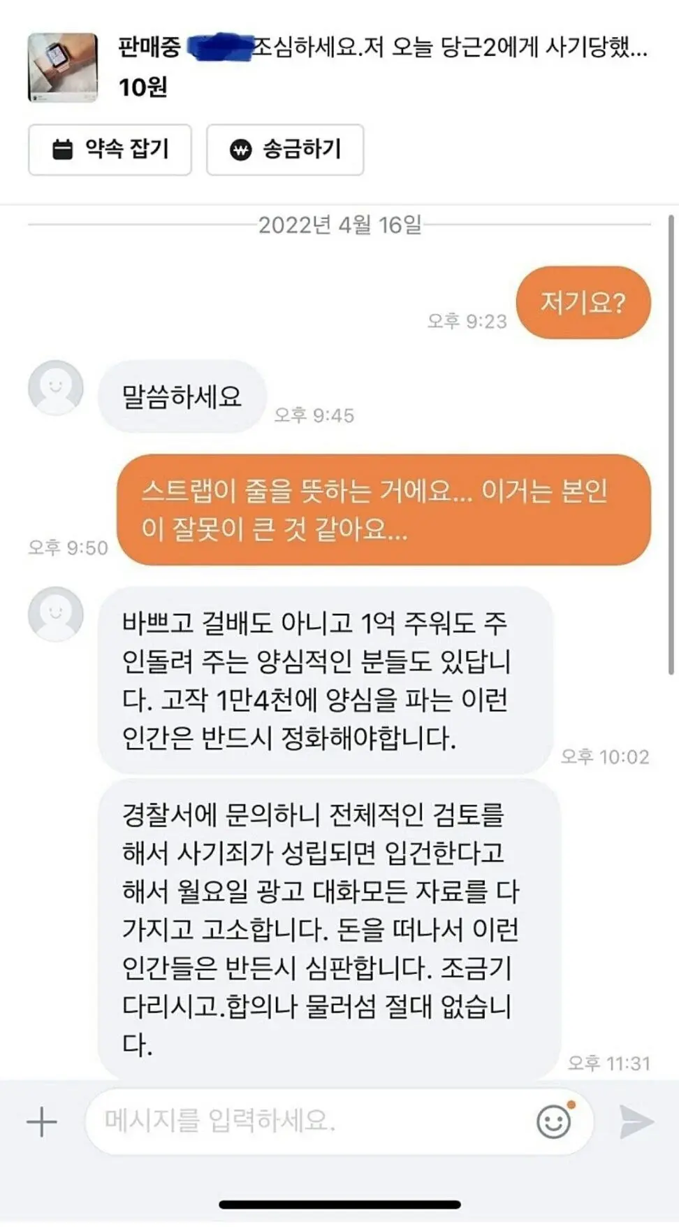 이건 다른 분이 스트랩은 시계줄이라고 알려쥤는데도 인간정화, 심판 언급하고 사기죄로 고소한다는 구매자