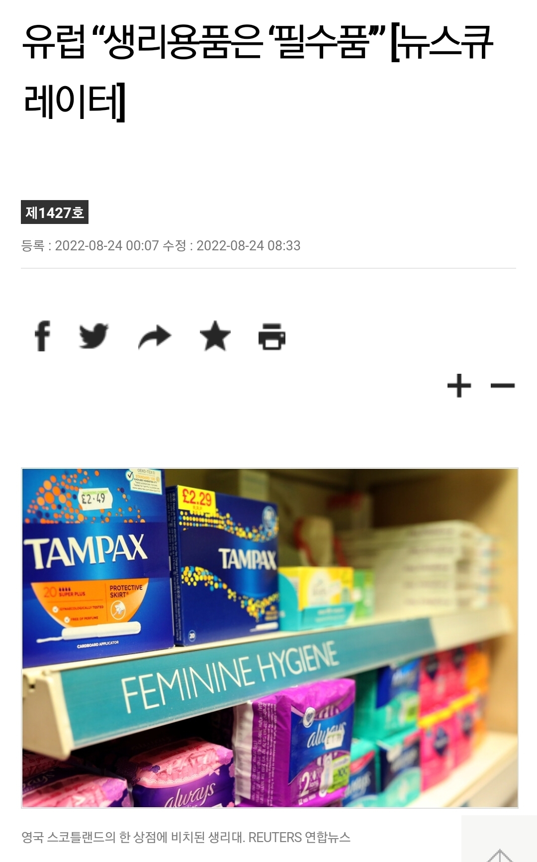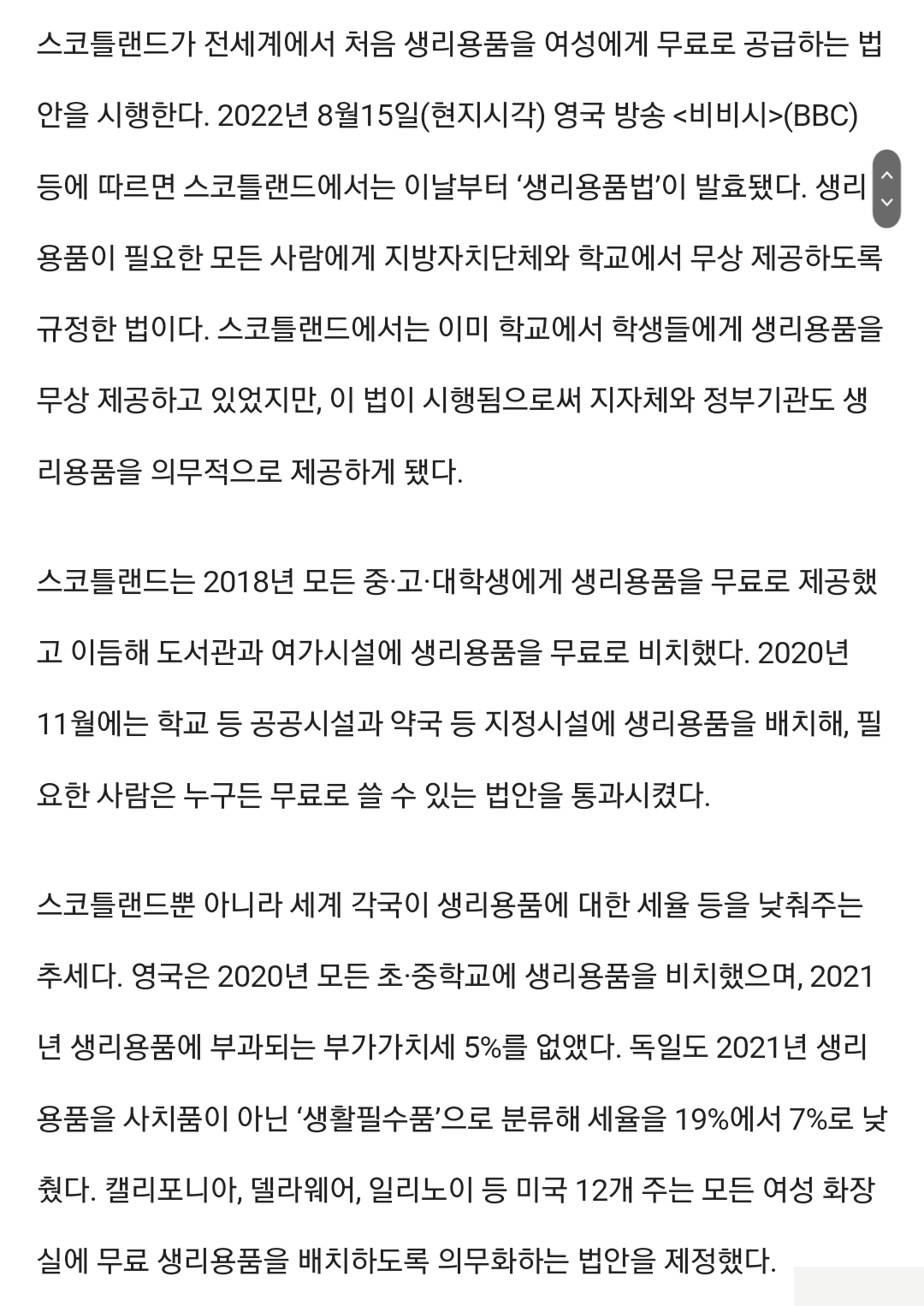 작성자고양이내고양이 작성시간 22.08.25 우리나라는 진작부터 생리대 (일부)면세제품이야 거의 20년전부터 면세 했어 … ㅋㅋ근데 생리대 회사에서 가격 안내리는거임…^^ㅋ담합인지 뭔지 가격자체를 안낮추는거…. 면세는 04년부터 시행함