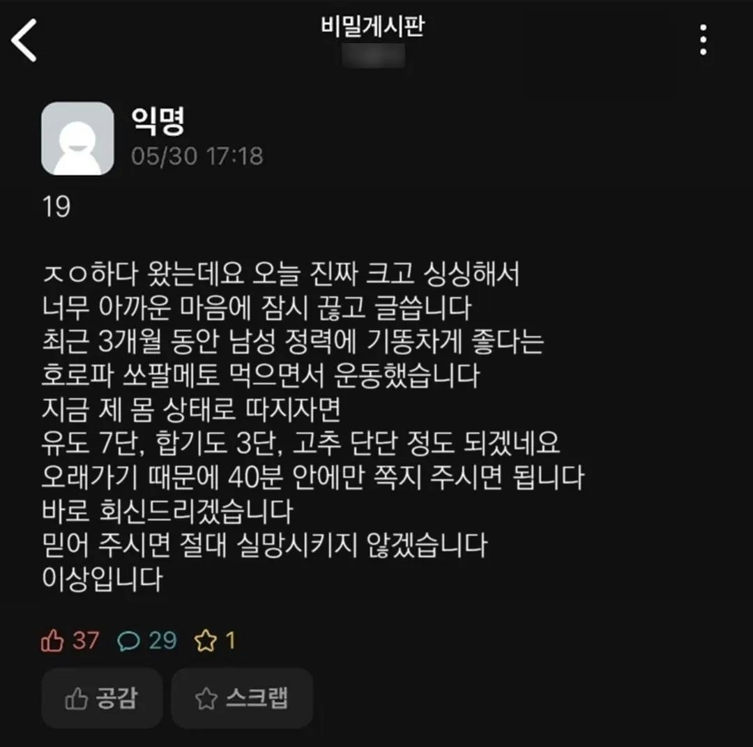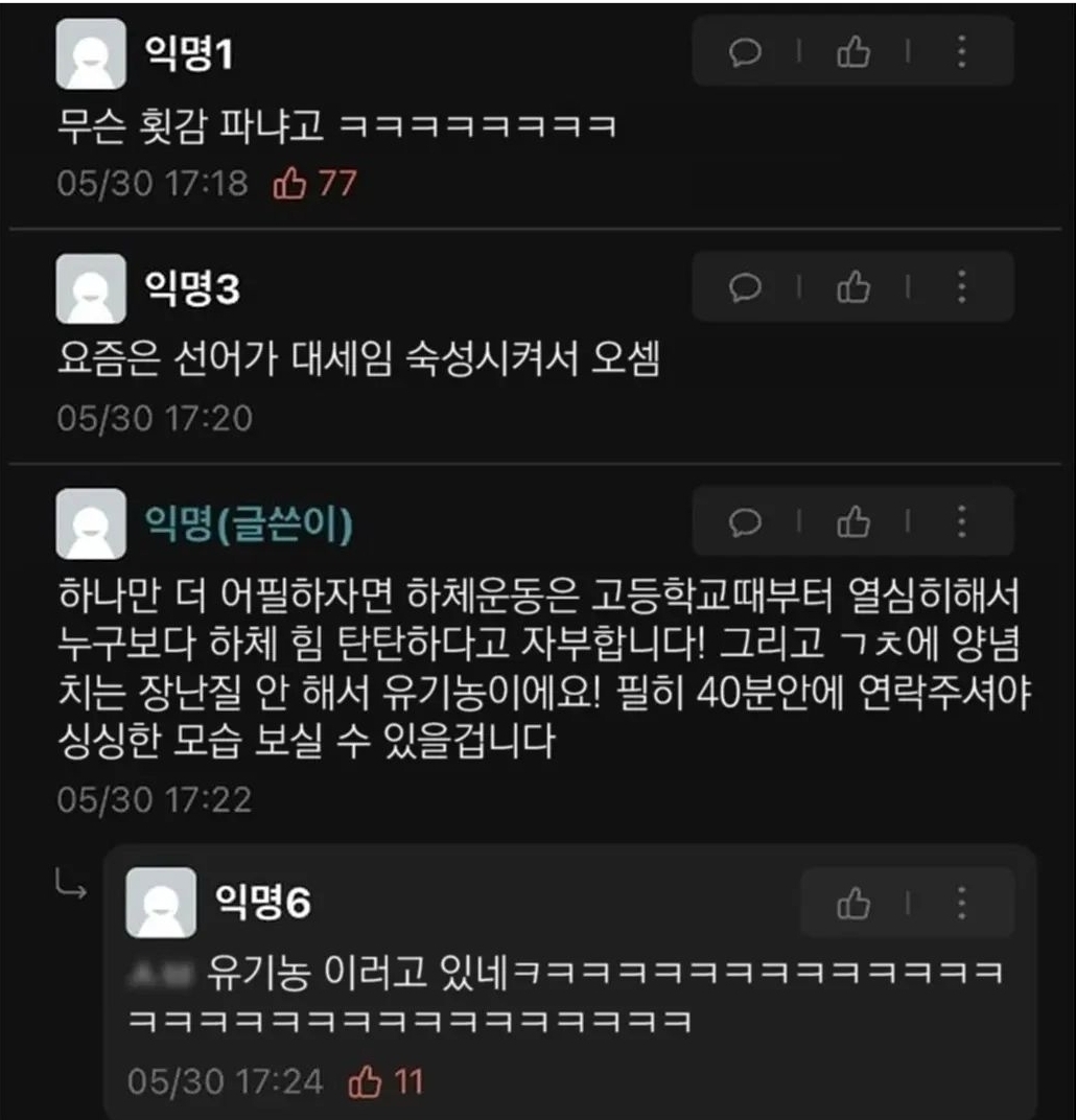 [칵.cxxxx]에타에 출몰한 유기농 고추 작성자NO:ZE|작성시간22.08.28|조회수10,631 목록 댓글 20 글자크기 작게가 글자크기 크게가 출처 : https://www.instagram.com/p/ChooDLbB2Yq/?igshid=YmMyMTA2M2Y=그래봤자 6.9 흔적 기관으로 뭘 하려고 다음검색 현재 게시글 추가 기능 열기 북마크 공유하기 신고 센터로 신고 댓글 댓글 20 댓글쓰기 답글쓰기 댓글 리스트 답댓글 작성자버칼샤브 | 작성시간 22.08.28 왜?!?!??! 개궁금하다 저게 어떻게 바이럴이여??? 진짜 별의 별 형식으로 바이럴글을 쓰는구나 작성자내 마루를 봐 대박임 | 작성시간 22.08.28 으 염병 작성자팡팡바라라라팡팡팡 | 작성시간 22.08.28 여자만 연락하라는 말 없으니까 남자들끼리 하면 되겄당! 답댓글 작성자금성뮤 | 작성시간 22.08.29 앗!! 국내산 고추가 2개!!! 작성자콜드모카 | 작성시간 22.08.28 남자끼리 해 댓글 전체보기