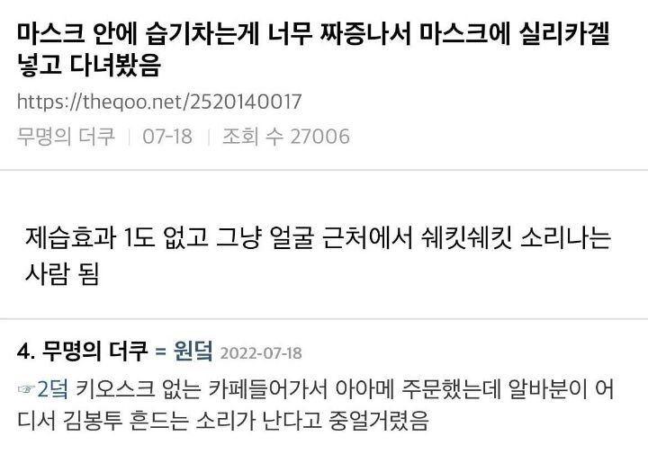 [스크랩] [흥미돋]마스크에 실리카겔 넣고다닌 후기 작성자도람도|작성시간22.08.28|조회수17,040 목록 댓글 12 글자크기 작게가 글자크기 크게가 출처 : 여성시대 (도람도)https://twitter.com/drip_party22/status/1552654965872611332?t=pJHVLP24r9mgYEToxdqNFA&s=19트위터에서 즐기는 드립대잔치“마스크에 실리카겔 넣고 다닌 후기”twitter.com미방 다음검색 스크랩 원문 : *여성시대* 차분한 20대들의 알흠다운 공간 현재 게시글 추가 기능 열기 북마크 공유하기 신고 센터로 신고 댓글 댓글 12 댓글쓰기 답글쓰기 댓글 리스트 작성자KYGO | 작성시간 22.08.28 아 존나웃겨 ㅅㅂㅋㅋ 삭제된 댓글입니다. 답댓글 작성자김삿갓 | 작성시간 22.08.28 헐 그렇구나 난 그냥 신발 속에 실리카겔 모으는 사람이었네.. 작성자찰랴 | 작성시간 22.08.28 아 ㅋㅋㅋㅋㅋㅋㅋㅋㅋㅋㅋㅋㅋㅋㅋㅋㅋㅋㅋㅋ 작성자여름이 막 | 작성시간 22.08.28 쉐킷쉐킷ㅋㅋㅋㅋㅋㅋㅋㅋㅋㅋㅋㅋㅋㅋㅋㅋㅋㅋㅋㅋㅋㅋㅋㅋ 댓글 전체보기