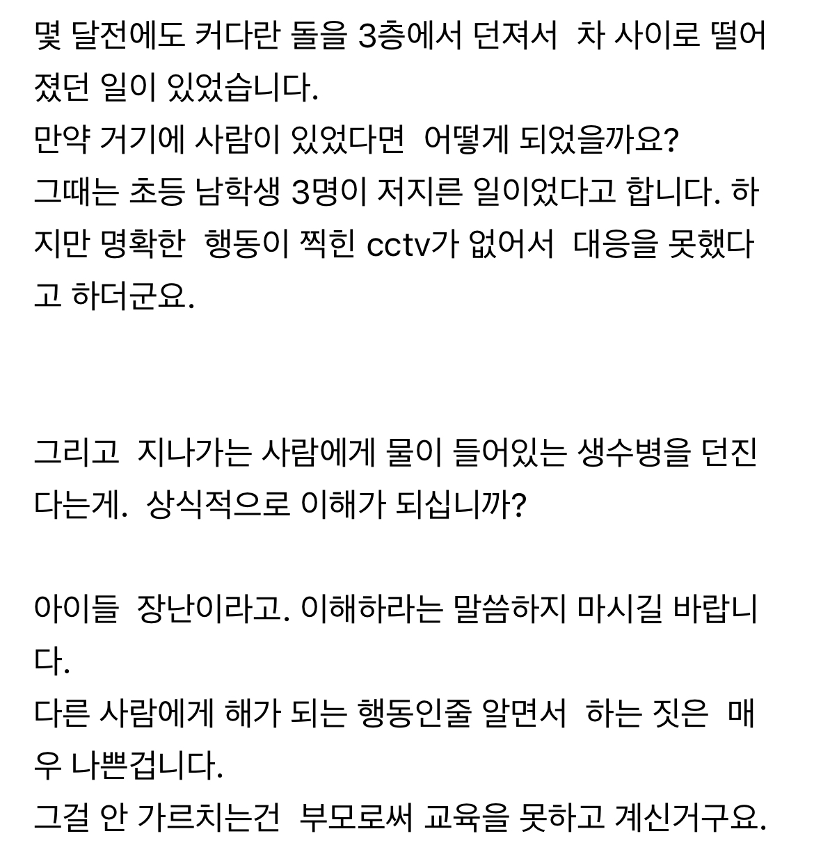 작성자oneforthechuck 작성시간 22.08.29 와 나도 몇달전에 길지나가는데 누가 상가옥상에서 유리던져서 내 바로 앞에서 와장창깨짐.....길가던 사람들 다 멈춰서 위 올려다봤는데 그 상가 학원다니는 꼬맹이였던거같음...