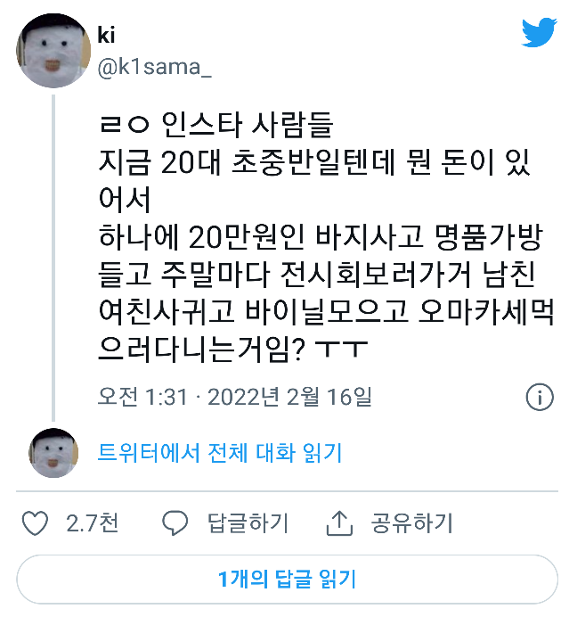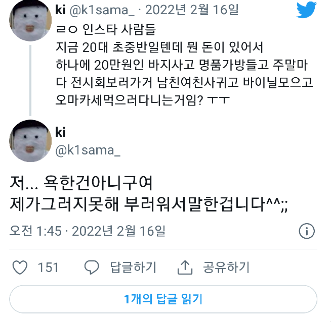 작성자똥통 작성시간 22.08.29 내 주변 그런 인스타들은 다 부잣집 자식이엇어