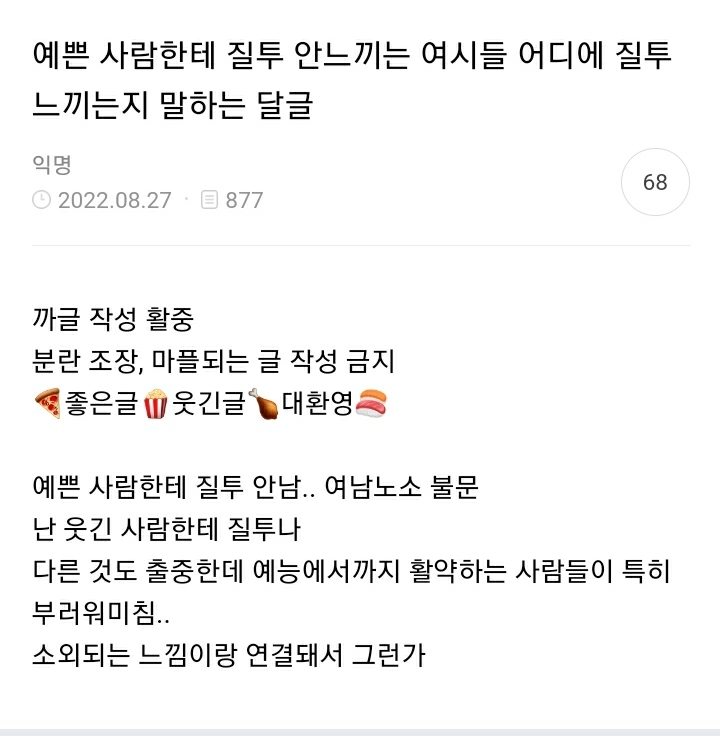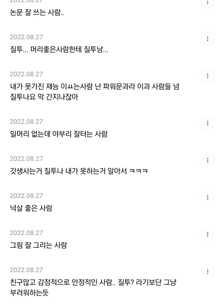 작성자썸머타임시작 작성시간 22.08.31 말이쁘게하는사람.... 질투라기보단 부럽고 선망의대상 같은느낌 ㅋㅋㅋ 질투란 감정을 명확히 이해못하겠다 부럽다 못해 오히려 그걸 미움으로 표현하는게 질투인건가?