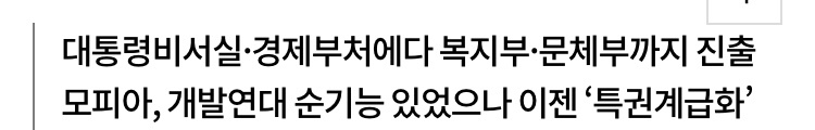 [스크랩] [여시뉴스데스크]모피아 싹쓸이, 이 정도면 ‘검찰+기재부’ 연합정부! 작성자다판다다다|작성시간22.09.04|조회수711 목록 댓글 0 글자크기 작게가 글자크기 크게가 출처 : https://m.hani.co.kr/arti/economy/economy_general/1043742.html#ace04ou[논썰] 모피아 싹쓸이, 이 정도면 ‘검찰+기재부’ 연합정부!대통령비서실·경제부처에다 복지부·문체부까지 진출모피아, 개발연대 순기능 있었으나 이젠 ‘특권계급화’퇴직 이후 로펌·대기업·금융회사 고위직으로 이직수억원대 고액 연봉 선후배인www.hani.co.kr 다음검색 스크랩 원문 : *여성시대* 차분한 20대들의 알흠다운 공간 현재 게시글 추가 기능 열기 북마크 공유하기 신고 센터로 신고 댓글 댓글 0 댓글쓰기 답글쓰기 댓글 리스트