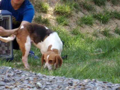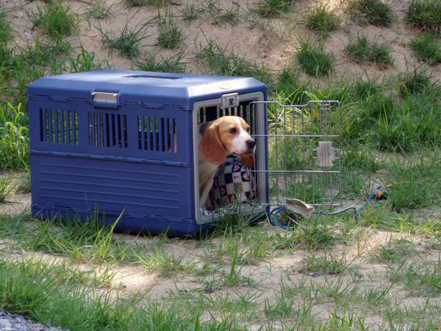 이 비글은 한참이 지나도록 켄넬 밖으로 나오지 못했어