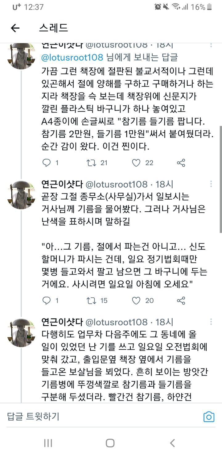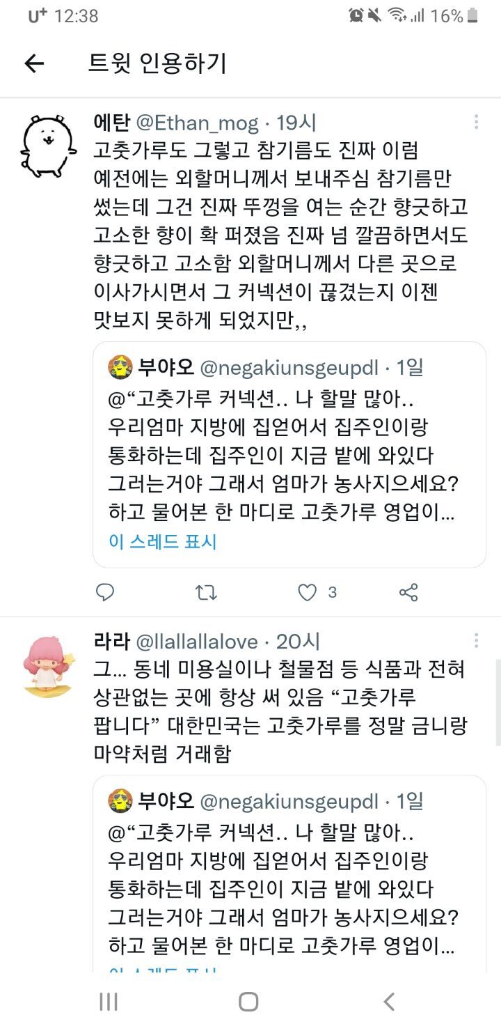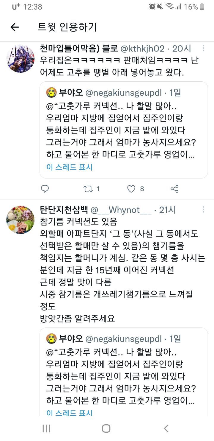 작성자에째래궤 작성시간 22.09.12 우리집도 참기름 들기름 고춧가루 고추장 된장 모두 외갓집 혹은 친할머니 루트통해서 얻어옴ㅋㅋㅋㅋ