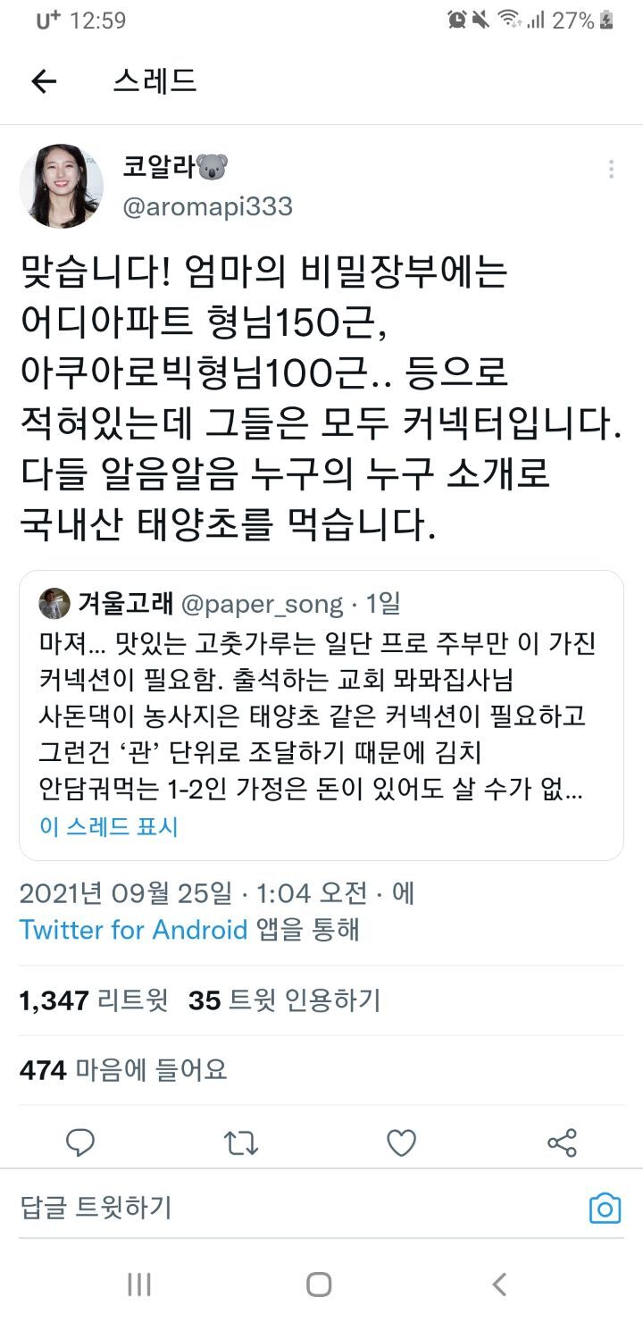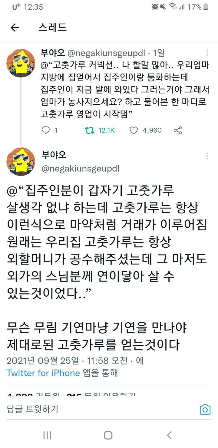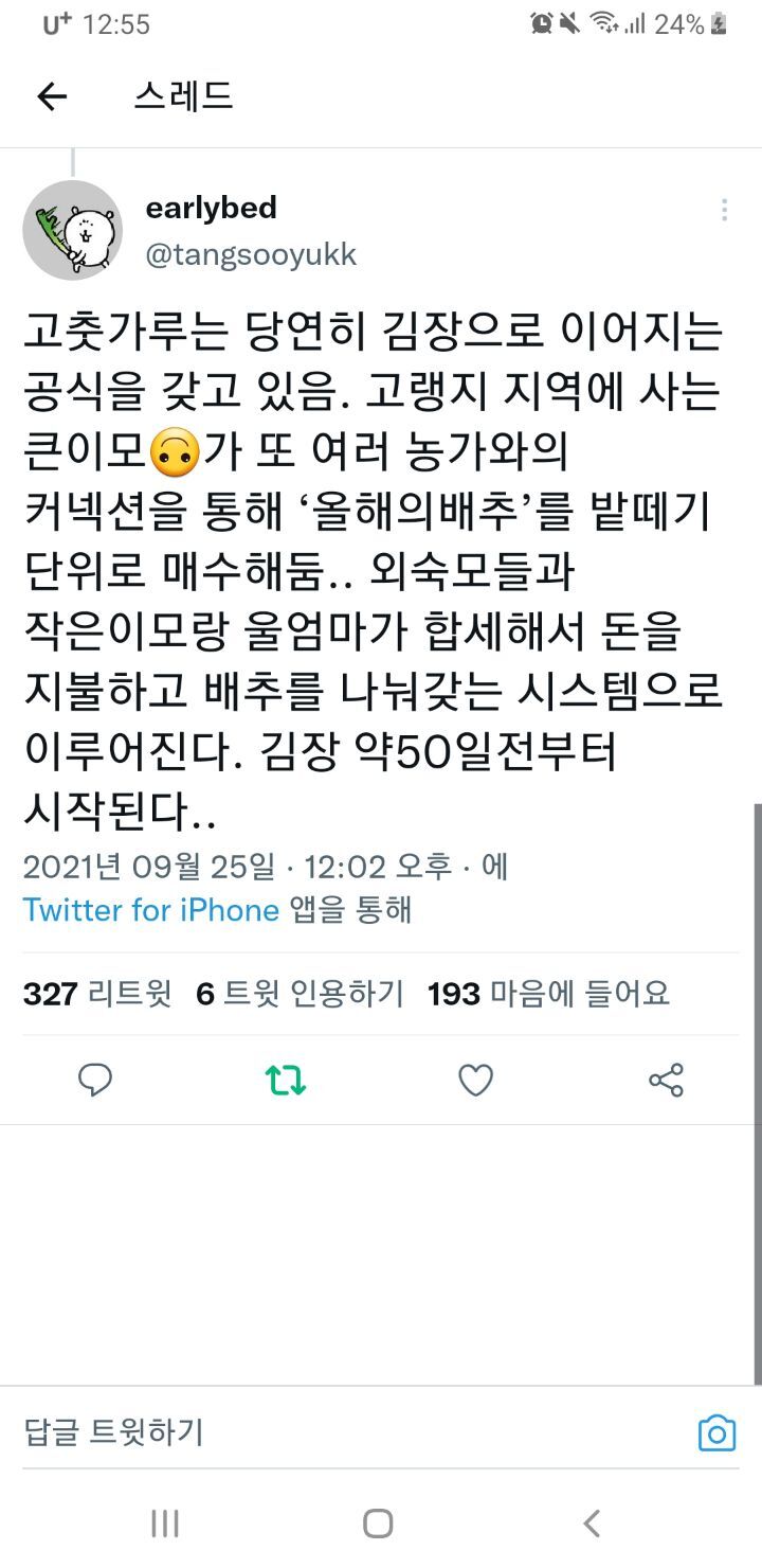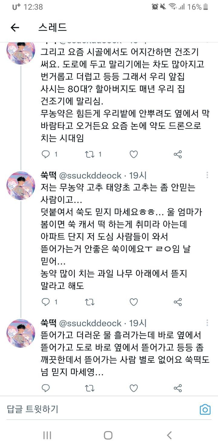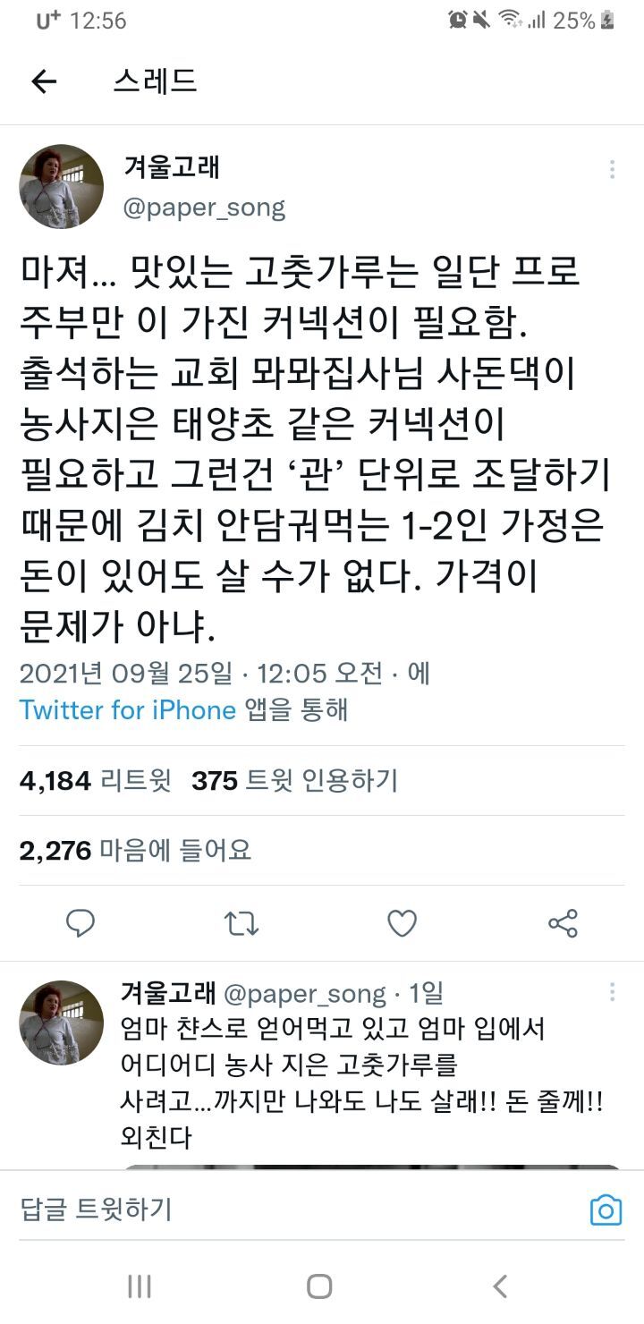 작성자효섭쓰 작성시간 22.09.12 우리도 아빠가 소소하게 농사짓는데 지금 고춧가루 엊제되냐 들기름은 언제짤거냨ㅋㅋ자기잊지말아달라는 전화 존나옴ㅋㅋㅋㅋㅋㅋ감자철엔 감자물어보고 옥수수철엔 옥수수물어보고 곧 김장철이니까 배추물어볼듯ㅋㅋㅋㅋ