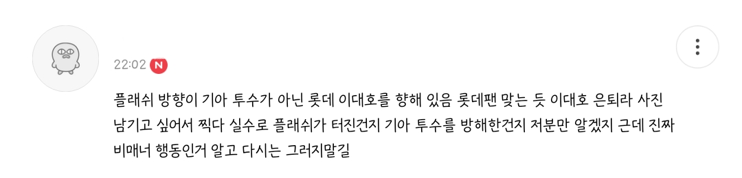 좀 악의적으로 보인다 저사람은 걍 구장에서 블랙리스트 올려야될거같아 기아선수들 너무 빡쳤겠다 -