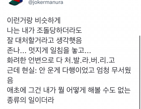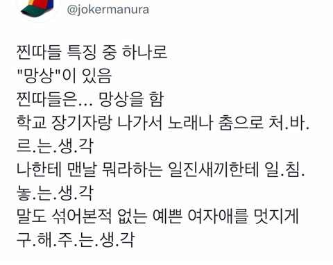 [스크랩] [흥미돋]찐따들 특징 중 하나로 ‘망상’이 있음 .twt 작성자엥?엥?엥?엥?엥?|작성시간22.09.19|조회수149,461 목록 댓글 86 글자크기 작게가 글자크기 크게가 출처 : https://twitter.com/jokermanura/status/1454429245875183619?s=21구름관찰자 on Twitter“찐따들 특징 중 하나로 "망상"이 있음 찐따들은... 망상을 함 학교 장기자랑 나가서 노래나 춤으로 처.바.르.는.생.각 나한테 맨날 뭐라하는 일진새끼한테 일.침.놓.는.생.각 말도 섞어본적 없는twitter.com 다음검색 스크랩 원문 : *여성시대* 차분한 20대들의 알흠다운 공간 현재 게시글 추가 기능 열기 북마크 공유하기 신고 센터로 신고 댓글 댓글 86 댓글쓰기 답글쓰기 댓글 리스트 작성자개빡친다진짜정말개빡쳐 | 작성시간 22.09.19 이미지 확대 작성자icando | 작성시간 22.09.19 어쩔tv 작성자한입보이 너를 원해 | 작성시간 22.09.20 ㅋㅋㅋㅋㅋ 근데 이거 mbti n 특징이더라 ㅋㅋㅋㅋㅋㅋㅋ 작성자행복하게 | 작성시간 22.09.23 나 찐따노 ㅠㅠ 작성자여자가늑대죠 남자는먹잇감찹찹 | 작성시간 22.09.27 나 찔려 댓글 전체보기