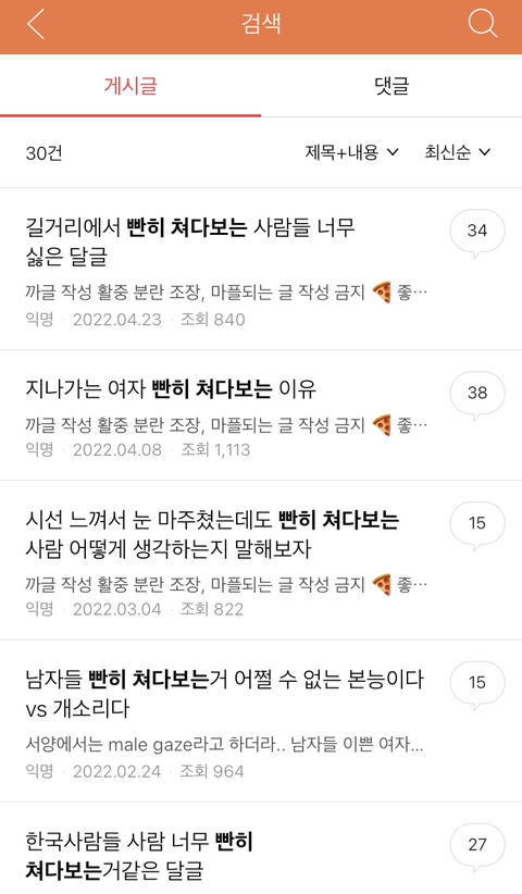 작성자설탕안먹어 작성시간 22.09.27 존나 싫어ㅡㅡ 가끔 길에서 삼초이상 눈 마주치는 새끼 있음 눈 똑바로 뜨고 뭘봐 씨발놈아 하는데 여자들은 같이 욕하고 남자애들은 왜 그렇게까지 하면서 나 말림ㅋ