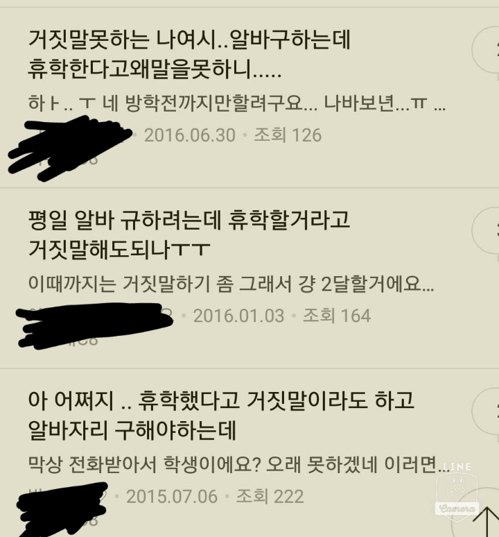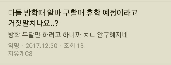 피치못할 사정이나 정말 조건 안 좋으면 중간에 그만둘수 있지 하지만 조건과 상관없이 6개월 안 채우고 방학때 2~3개월 일하다가 개강시즌에 구구절절 온갖 핑계대고 그만두면 그 노양심 덕분에 알바 구하려는 사람 고용주 같이 일하는 알바생한테도 민페야 알바 구하려고 연락하면 대학생은 개강쯤에 다 그만둬서 안 뽑아요 이 소리만 들어 익담만 봐도 6개월 이상 구하는데 휴학생이라 거짓말 하고 2~3개월만 할까? 경력자라 뻥치고 알바 구할까? 이런 글 많지? 그 행동이 모두에게 민폐야