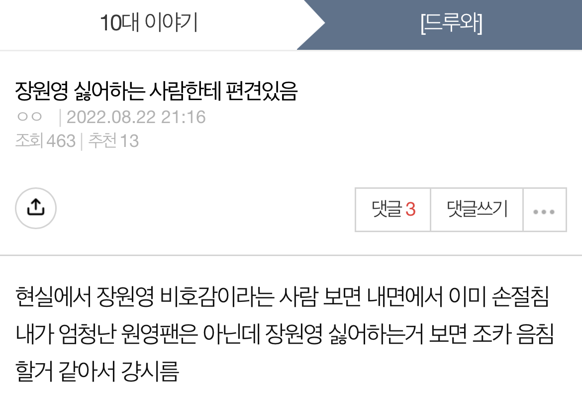 작성자오쪼쪼쪼쪼쪼쪼 작성시간 22.10.04 걍 그 어린애 깔게 뭐있다고 아득바득 찾아서 싫어하는거같아서 별로긴함ㅋㅋㅋㅋㅋㅋㅋㅋㅋ같은 맥락으로 별것도 아닌걸로 여연 싫어하는것도ㅠ