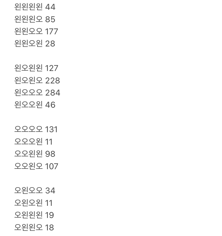 [흥미돋]왼오왼오 작성자유려한|작성시간22.10.05|조회수40,719 목록 댓글 1,343 글자크기 작게가 글자크기 크게가 출처 : 여성시대 유려한(남초꺼 쌔벼왓어 이제 내꺼)난 왼오왼오여시들은 어떤 타입?!+ 1600플 넘은 기념 중간 집계글자 그대로 검색한거라 집계 안된 댓글도 있음 ㅠ1400-1500명 정도 현황👑1위 왼오오오🙊공동14위 오오오왼 / 오왼오왼ㄱㅆ픽은 2등... 힘냅시다 왼오왼오 여시들당신의 취향에게 투표하세요 다음검색 현재 게시글 추가 기능 열기 북마크 공유하기 신고 센터로 신고 댓글 댓글 1,343 댓글쓰기 답글쓰기 댓글 리스트 작성자나를 웃긴 닉 모음 | 작성시간 22.10.08 왼왼왼왼 작성자17호 | 작성시간 22.10.09 오왼왼오 작성자방귀쟁이뿡뿡이 | 작성시간 22.10.09 오오오왼 작성자하루종일배고프다 | 작성시간 22.10.09 왼왼왼오 작성자로제떡볶이 광인 | 작성시간 22.10.22 오 오왼오 댓글 전체보기