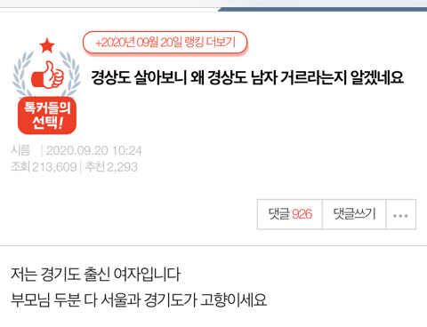 작성자쏭쏭삥 작성시간 22.10.09 전라도 사람들 욕하는거 많던데 난 서울 사람이지만 경상도 남자들 극혐.. 우리 팀장 경상도 사람인데 입에 여자가 여자가~6년차인 나한테 커피타오라고 해서 팀장님이 타서 드시라고 던 커피 안먹는다고 말했더니 노발대발..