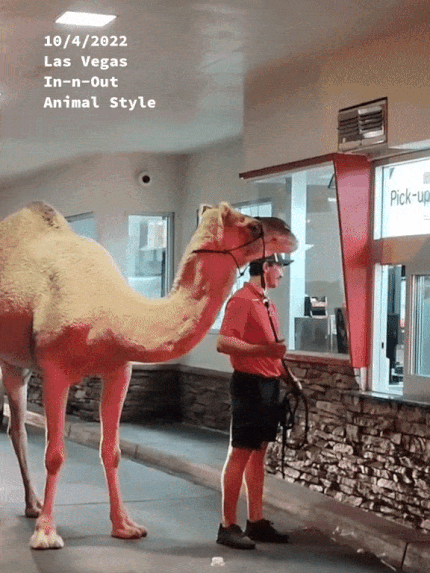 지난 4일 밤 라스베이거스 한 도심에 등장한 이 낙타는 한 남성 조련사와 함께 햄버거 전문점 길목으로 들어섰습니다.