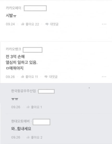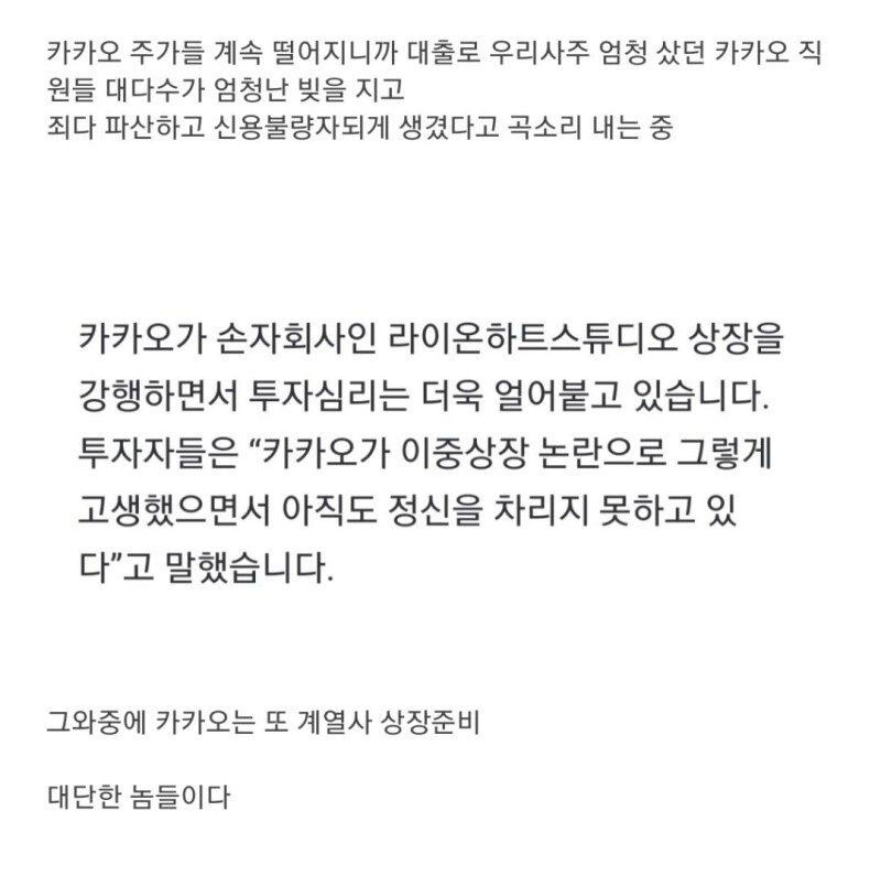 작성자cienbli 작성시간 22.10.17 관심있어서 기사 찾아보는 중인데 댓글 참.. 임원들이 팔 수 있더라도 보통 안파는 게 상도덕이지. 자기 회사 믿은 직원들이 불쌍하게 된 건데 자랑한 것 때문에 마음이 꼬였나 직원들이 더 욕먹네. 사람의 욕망을 과소평가하는 건지 본인이 그 상황이었으면 욕심 안부릴 자신 있는지. 의사결정자들 때문에 카카오는 앞으로도 전망이 어둡겠다 싶네.