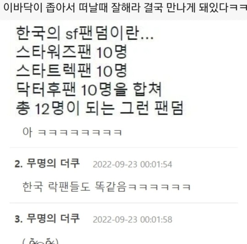 [배꼽의행방]한국의 SF 팬덤 규모 작성자리샤|작성시간22.10.11|조회수8,943 목록 댓글 60 글자크기 작게가 글자크기 크게가 출처 : 여성시대 리샤 https://www.dogdrip.net/437210773 다음검색 현재 게시글 추가 기능 열기 북마크 공유하기 신고 센터로 신고 댓글 댓글 60 댓글쓰기 답글쓰기 댓글 리스트 작성자눈을봐라그러고도남을놈이다 | 작성시간 22.10.11 ㄱㅇㄱㅋㅋㅋㅋㅋㅋㅋㅋㅋㅋㅋㅋㅋㅋㅋㅋㅋㅋㅋㅋㅋ 작성자페찌 | 작성시간 22.10.11 ㅋㅋㅋㅋㅋㅋㅋㅋㅋㅋㅋㅋㅋㅋㅋㅋㅋㅋㅋㅋㅋㅋㅋㅋㅋㅋㅋㅋㅋㅋㅋㅋㅋㅋㅋㅋㅋ 작성자간죽간살닭도리 | 작성시간 22.10.11 ㅅㅂㅋㅋㅋㅋㅋㅋㅋ 작성자찰스자비에 | 작성시간 22.10.11 오 트레키이자 50살 아가의 팬이자 락덕은 아니지만 락페 3일권은 끊는 나의 얘기네 작성자뽀송한이불 | 작성시간 22.10.11 zzzzzzㅌㅌㅌㅌㅌㅌㅋㅋㅋㅋㅋㅋㅋㅋ 댓글 전체보기