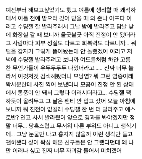 작성자뿌링클와구와구 작성시간 22.10.12 왁서 실력보다 피부 차이 아냐? 나 초경때 생리대 첨 써봤다가 저런거 났었음