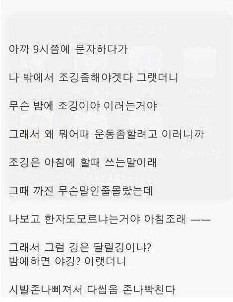 [스크랩] [흥미돋]조깅이 한자라고? 작성자놀랍다놀라워|작성시간22.10.16|조회수5,892 목록 댓글 19 글자크기 작게가 글자크기 크게가 출처 : https://m.cafe.daum.net/subdued20club/ReHf/2000571?svc=cafeapp는리얼임 ㅇㅇ...(합성이야 여시덜 찡긋) 다음검색 스크랩 원문 : *여성시대* 차분한 20대들의 알흠다운 공간 현재 게시글 추가 기능 열기 북마크 공유하기 신고 센터로 신고 댓글 댓글 19 댓글쓰기 답글쓰기 댓글 리스트 작성자우리초파리 느그벼파 | 작성시간 22.10.16 그래서 레깅스도 뛸깅이구ㄴ? ㅎ ㅋㅋ 작성자꽁돈생김 | 작성시간 22.10.16 이거 ㄱㄱㅋㄱ광희도이러던데ㄱㅋㄱ이준 광희 깡ㅎㅇ 작성자라베야 | 작성시간 22.10.16 달릴깅 ㅅㅂㅋㅋㅋㅋㅋㅋㅋㅋㅋㅋㅋㅋㅋ 작성자상어송 | 작성시간 22.10.17 깊을 딥 이냐고ㅠ 작성자방구뽕입니다 | 작성시간 22.10.17 뛸깅 댓글 전체보기